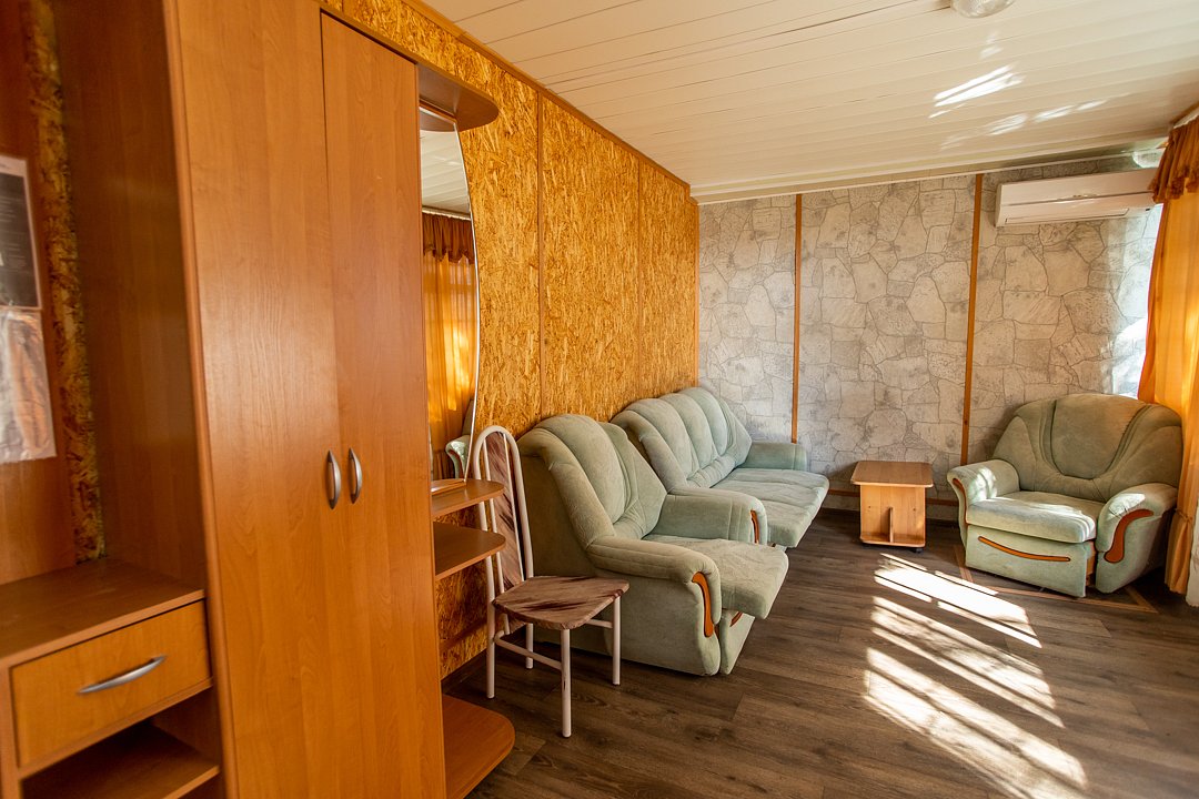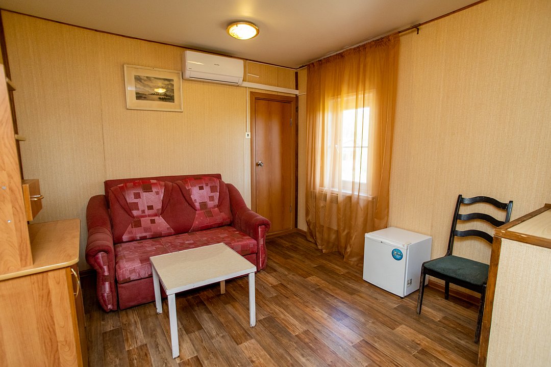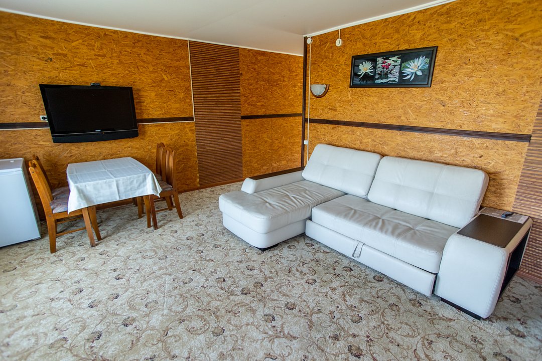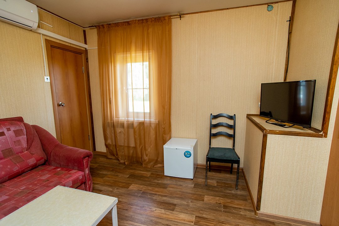 В номере диван и два кресла, индивидуальный санузел, сплит-система/кондиционер. Номер оснащен холодильником, телевизором. Идеально для рыболовно-охотничьего тура. В стоимость входит проживание, трехразовое питание, водный трансфер, услуги егеря с моторной лодкой (при размещении в лодке 2-3 человека).