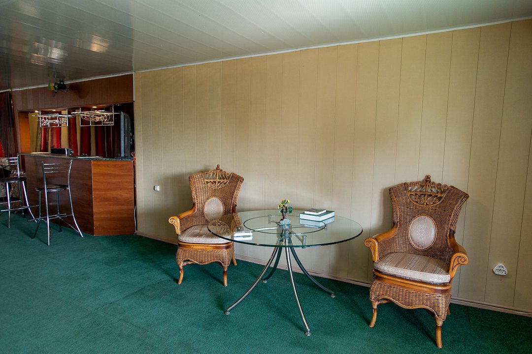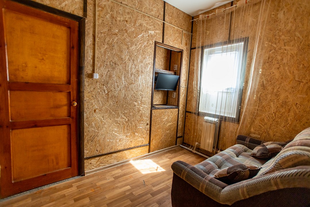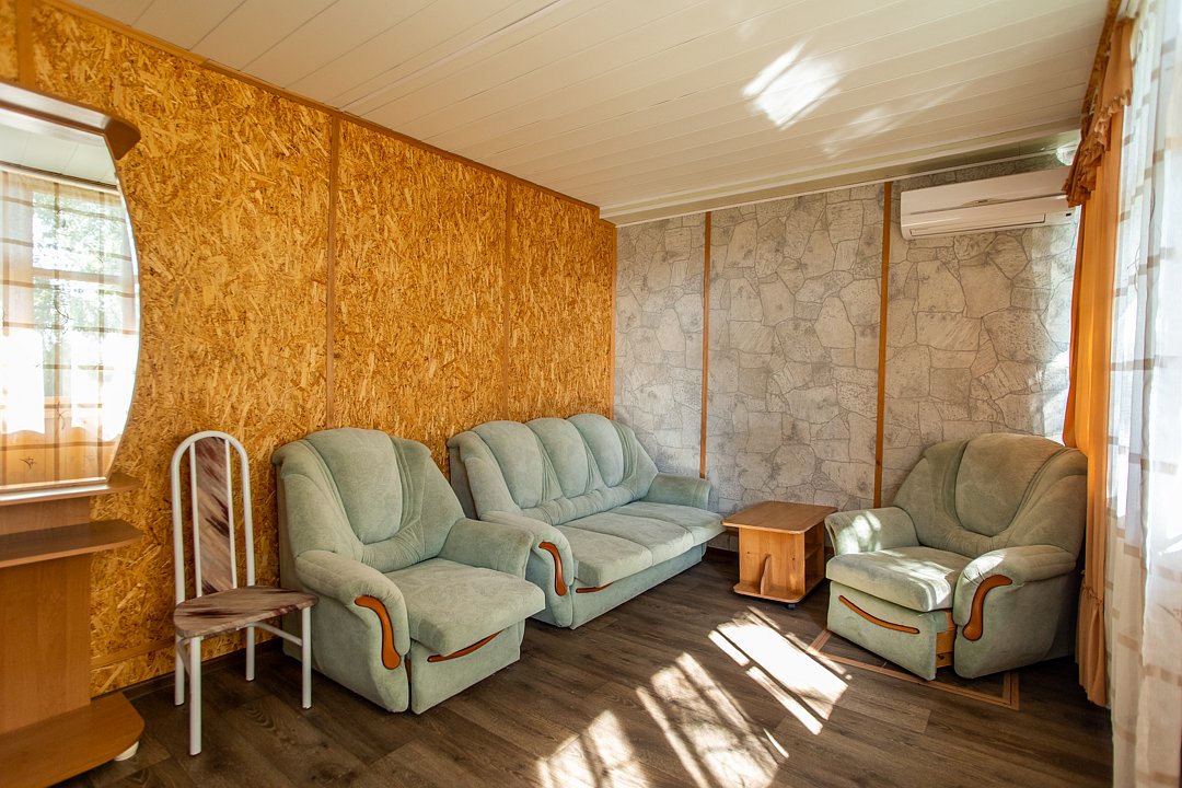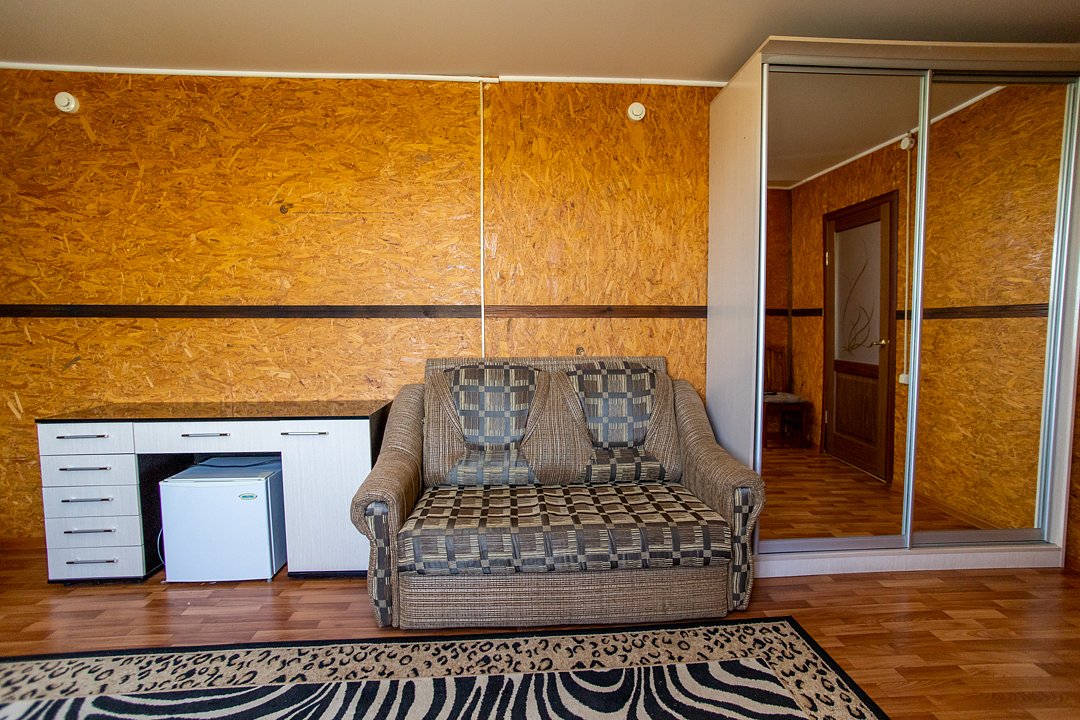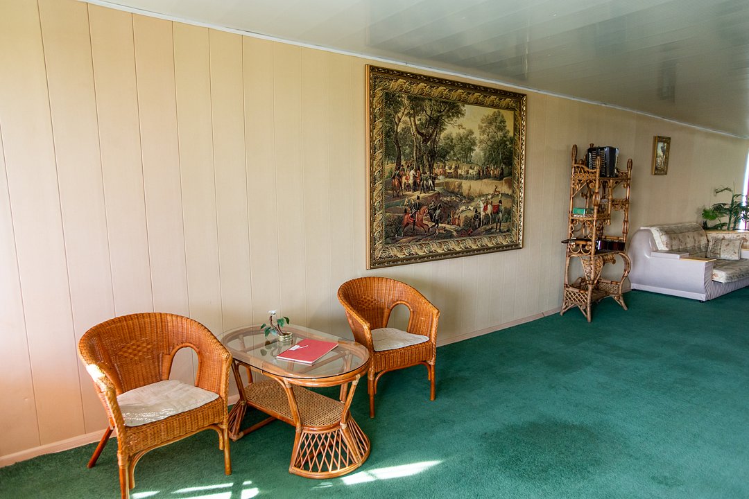 В номере диван и два кресла, индивидуальный санузел, сплит-система/кондиционер. Номер оснащен холодильником, телевизором. Идеально для рыболовно-охотничьего тура. В стоимость входит проживание, трехразовое питание, водный трансфер, услуги егеря с моторной лодкой (при размещении в лодке 2-3 человека).