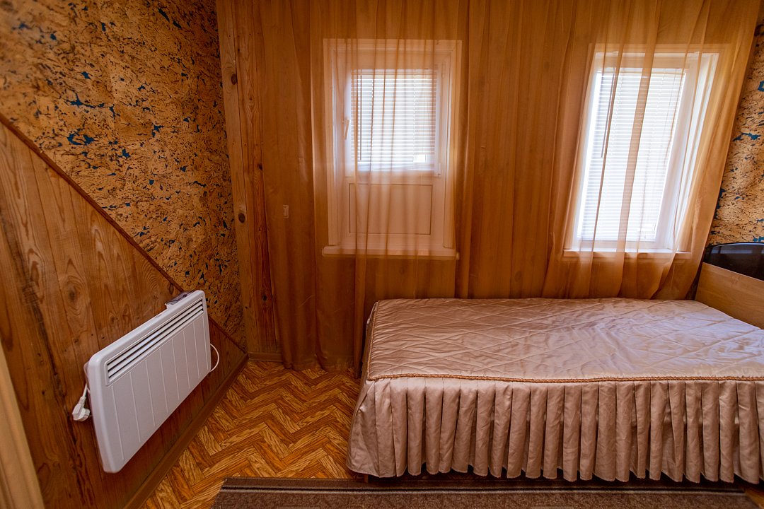 В номере две двуспальных кровати, индивидуальный санузел, сплит-система/кондиционер. Номер оснащен холодильником, двумя телевизорами. Идеально для рыболовно-охотничьего тура. В стоимость входит проживание, трехразовое питание, водный трансфер, услуги егеря с моторной лодкой (при размещении в лодке 2-3 человека).