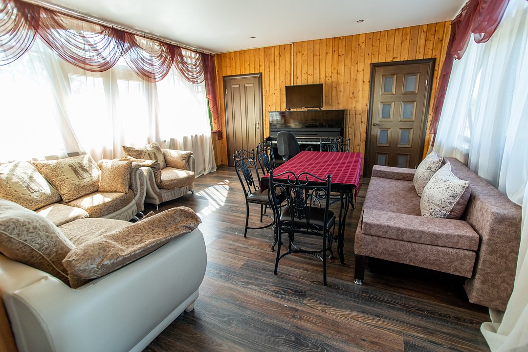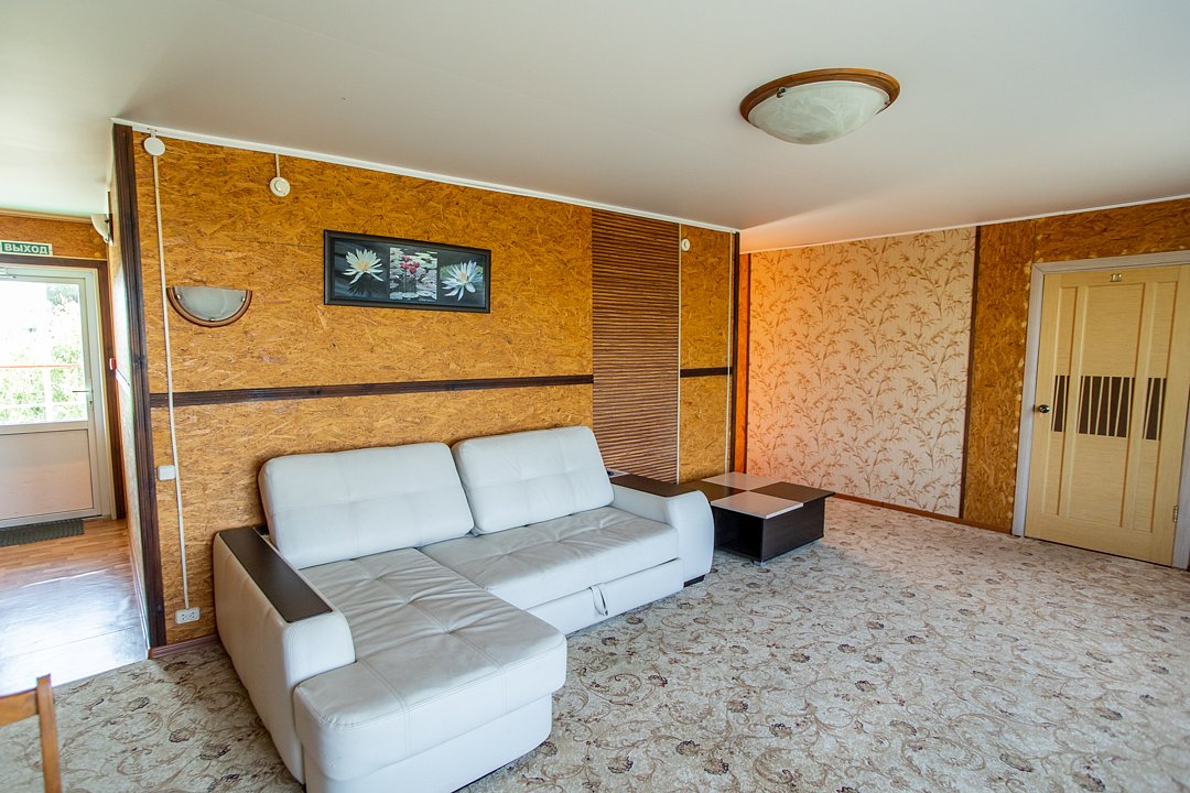 В номере три двуспальных кровати, диван, два индивидуальных санузла, сплит-система/кондиционер, пианино. Номер оснащен холодильником, телевизором, обеденным столом. Идеально для рыболовно-охотничьего тура. В стоимость входит проживание, трехразовое питание, водный трансфер, услуги егеря с моторной лодкой (при размещении в лодке 2-3 человека).
