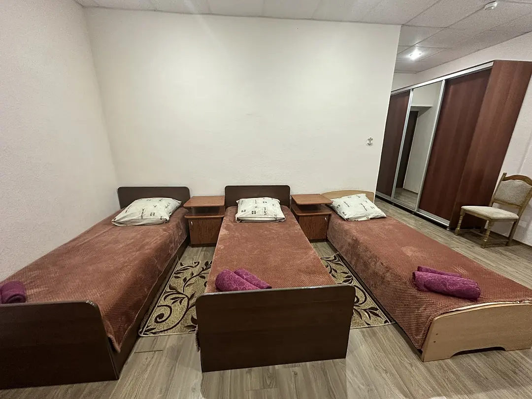 Однокомнатный номер для семьи из троих человек (2 взр+ребенок), в номере двуспальная кровать, односпальная кровать, сплит система, телевизор, холодильник, TV приставка, Wi-Fi, ванная комната с душем.