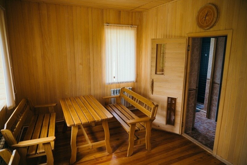 Русская баня с просторной парилкой из канадского клёна и солевыми лампами; с комнатой отдыха и выходом на воду.