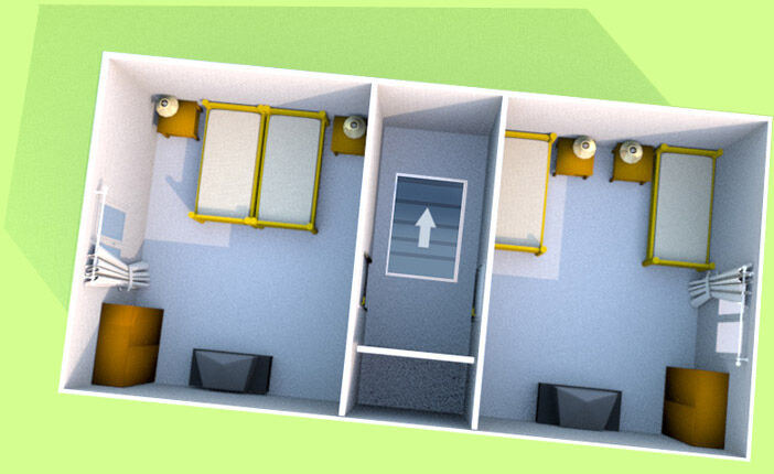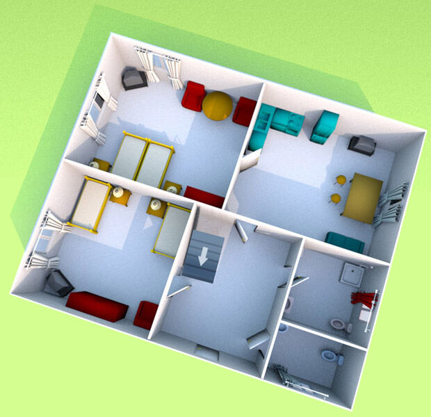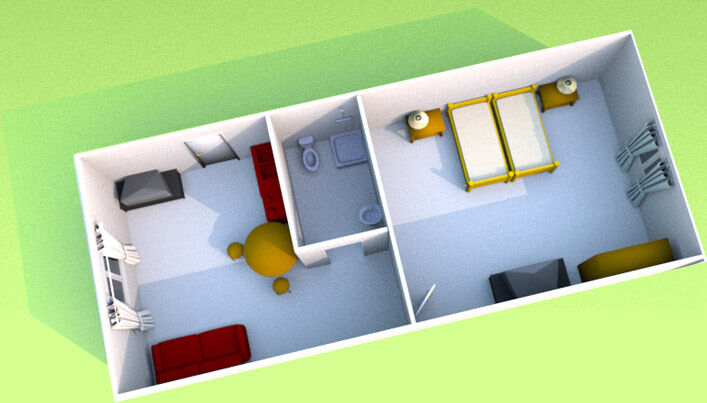 4 двухместные спальни, комната отдыха с холодильником и электрочайником, морозильная камера, ванная комната с душевой кабиной и санузлом, отдельный санузел. Каждый номер и комната оборудованы сплит-системой, ЖК-телевизором 32” со спутниковым TV, индивидуальным отоплением.