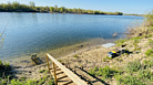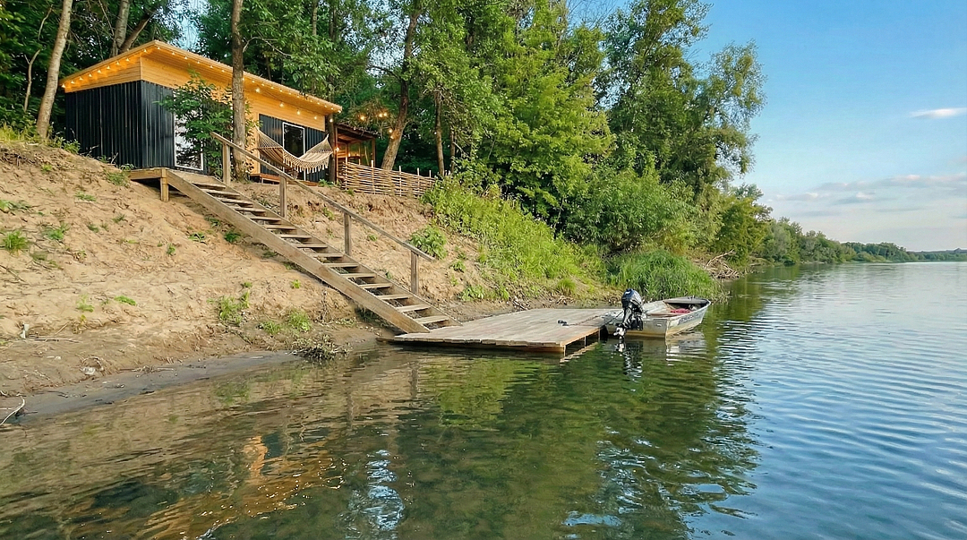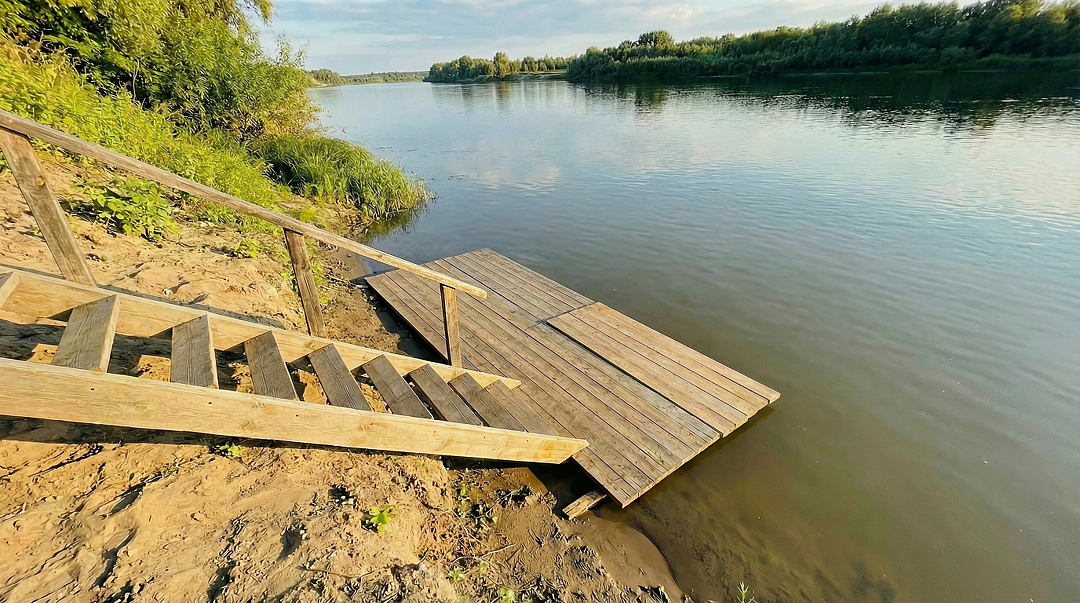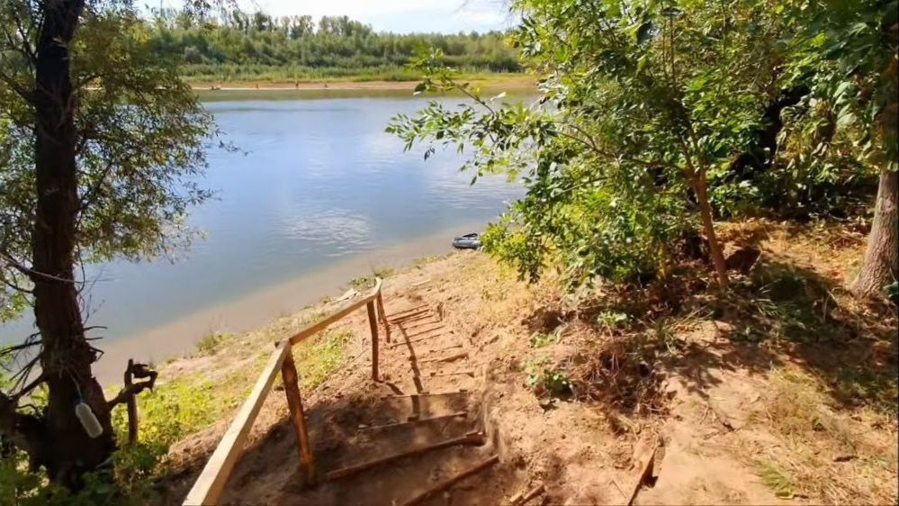 Инфраструктура для рыбака: Личный спуск к воде (крутой, около 12 ступеней) и причал для лодки, а также столик для чистки рыбы.
