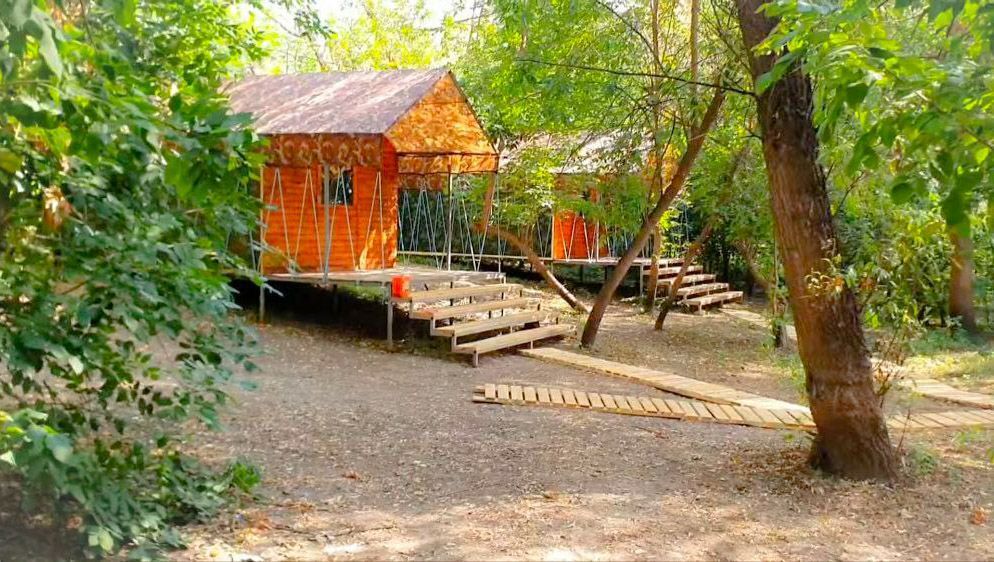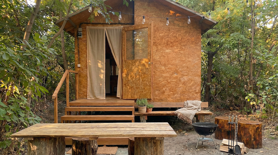 Мини деревня из эко-домиков в лесном массиве на берегу реки.