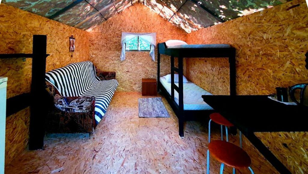 В домике душ с туалетом, большая двухъярусная кровать с удобными матрасами, раскладной диван. Холодильник, телевизор, электрический чайник и столовая посуда, постельное бельё и полотенца.