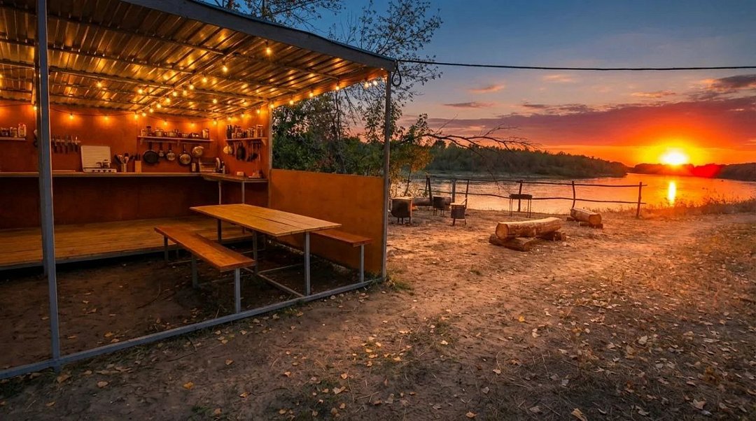 Настоящее сердце комплекса это мангальная на берегу: Просторная территория с зоной отдыха несколькими мангалами, казанами и зоной барбекю. Хватит места всем, чтобы готовить, общаться и делиться впечатлениями о пойманных трофеях.