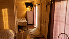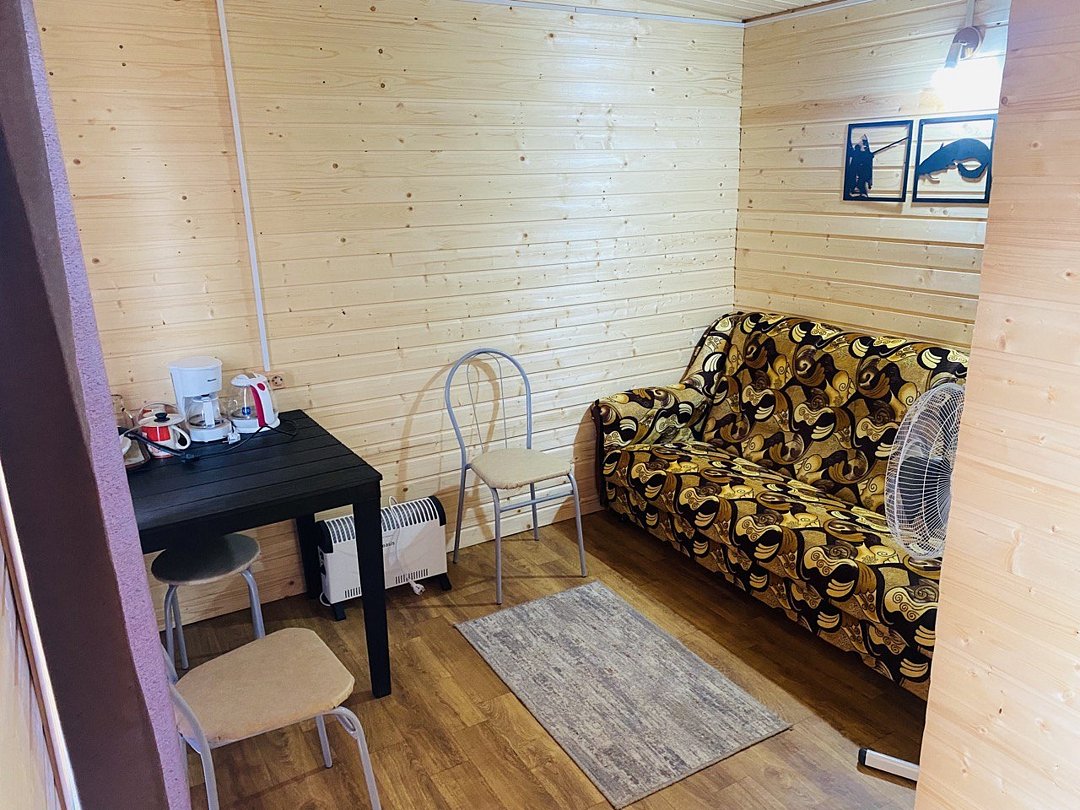 В домике большая двухъярусная кровать с удобными матрасами, раскладной диван. Холодильник, телевизор, обогреватель, кондиционер, электрический чайник и столовая посуда, постельное бельё и полотенца.