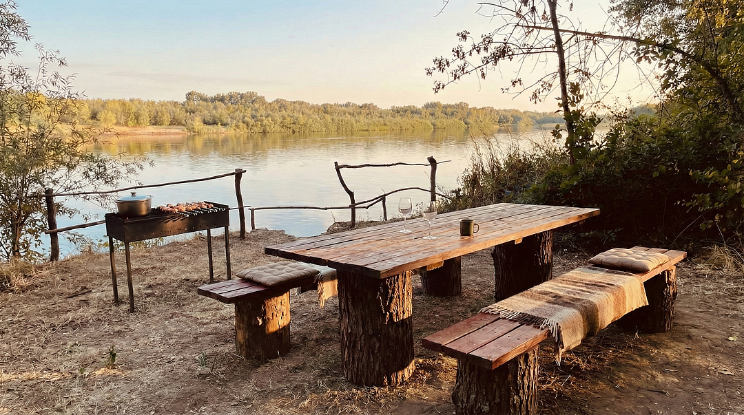 Настоящее сердце комплекса это мангальная на берегу: просторная территория с зоной отдыха несколькими мангалами, казанами и зоной барбекю. Хватит места всем, чтобы готовить, общаться и делиться впечатлениями о пойманных трофеях.