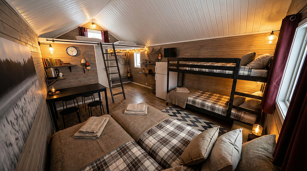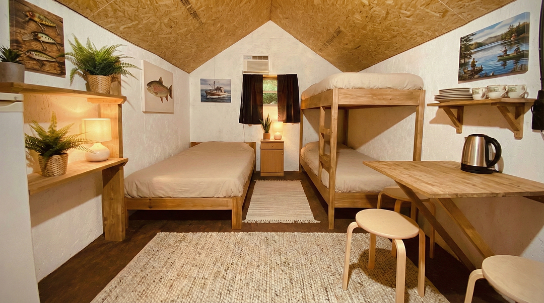 Вас ждет комфортная планировка с двуспальной кроватью, двухъярусной кроватью и уютными двухместными антресолями. В каждом домике есть кондиционер, телевизор, холодильник, а также душ горячей водой и туалет, обеденный стол и вся необходимая посуда.