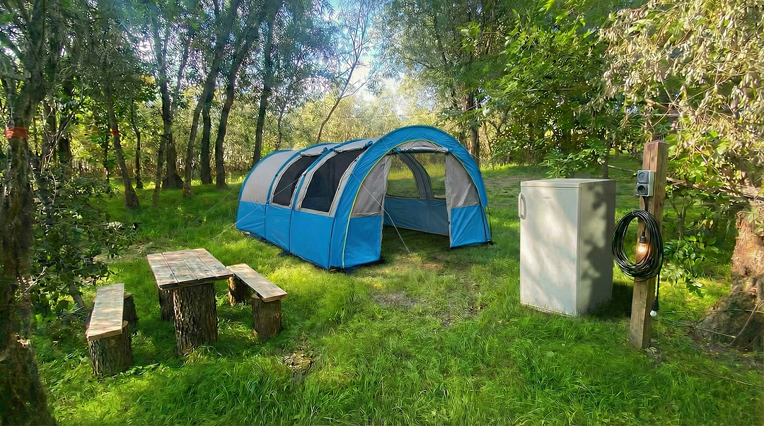 Можно арендовать палатку на базе отдыха с кроватями или матрасами и холодильником (дополнительно оплачивается).