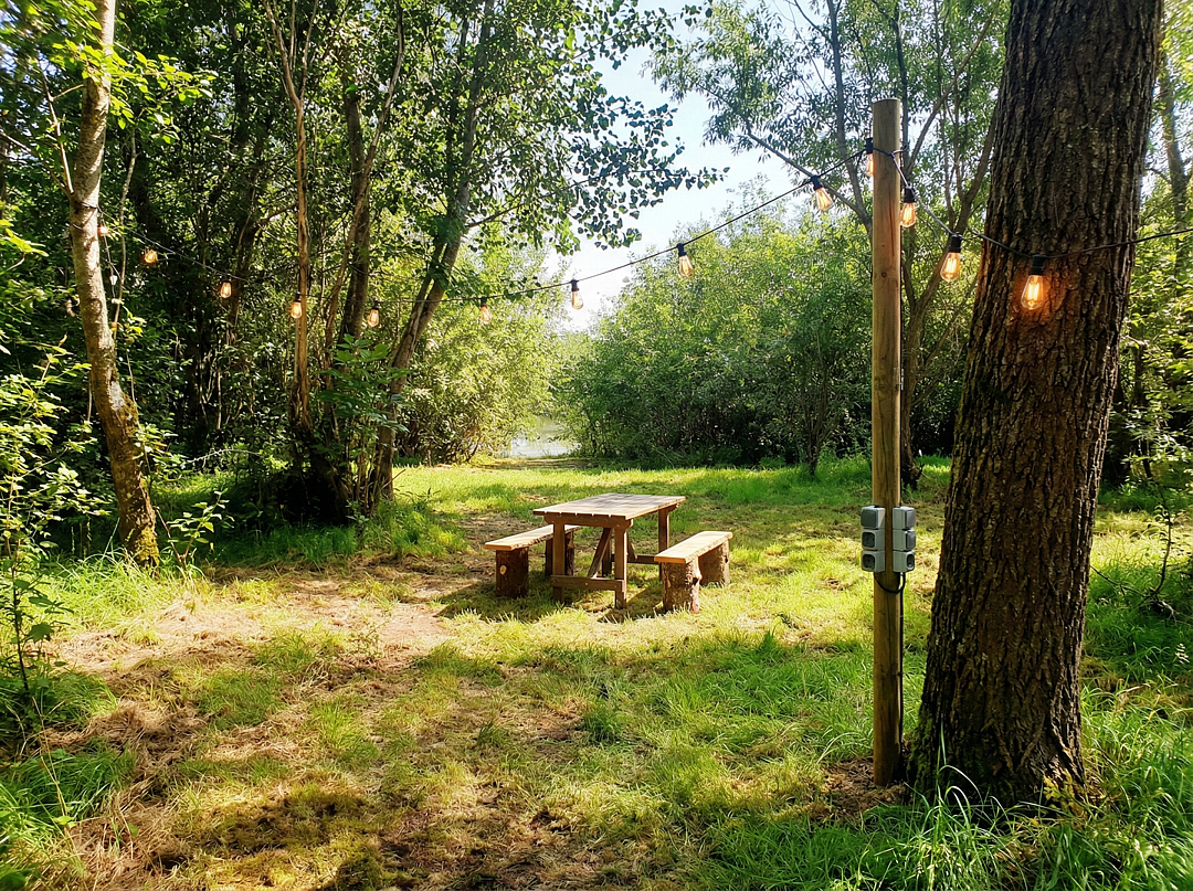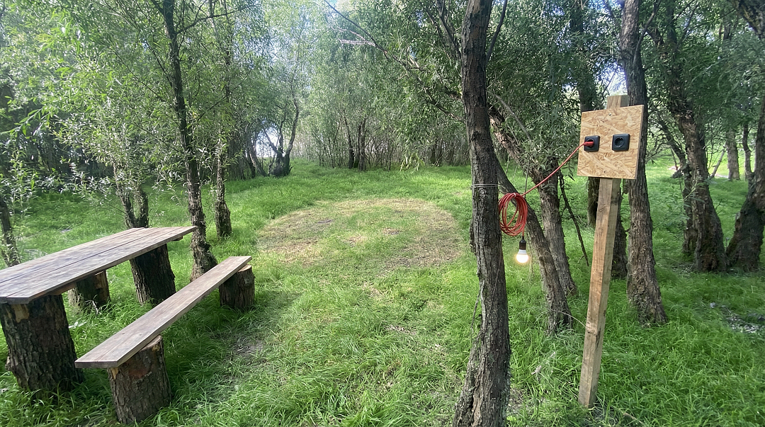 У каждого места своё большое пространство визуально огороженное, навесом со столом и лавками, напротив свой подход к воде с местом для береговой ловли и купания. Каждое место рассчитано минимум на установку двух больших палаток и шатра для кухни.