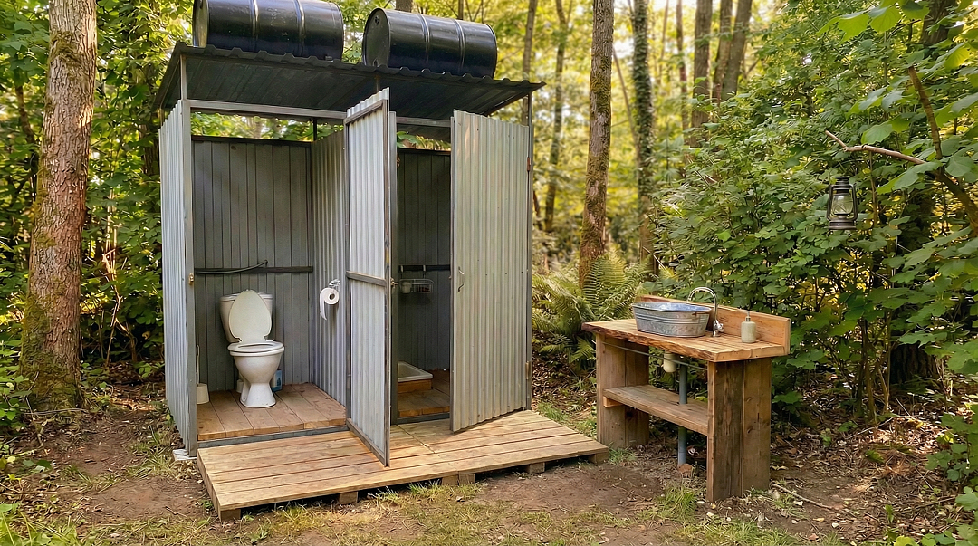 Несколько общих летних туалетов и душевых кабин с проточной горячей водой.