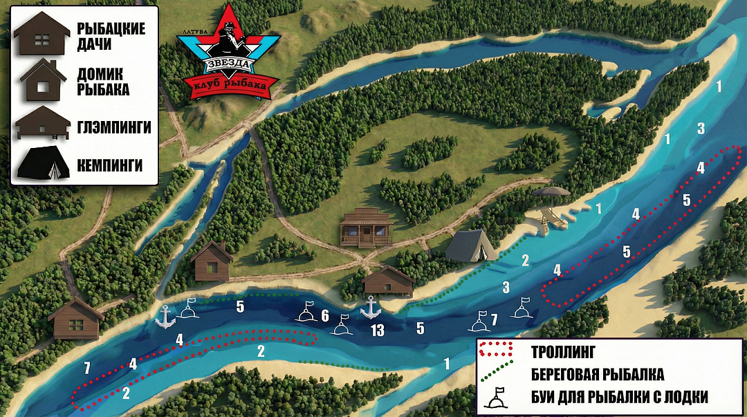 На территории базы имеется 25 секторов для рыбалки. Береговая линия раскинулась на 2,5 километра от большого яра до песчаных плоскостей, что удовлетворит все потребности рыбаков.