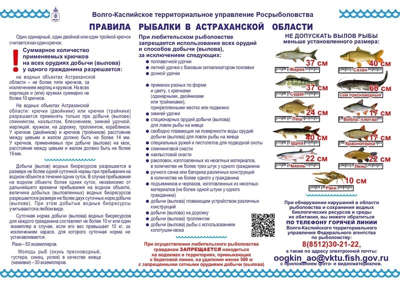 Внимание! C 6 апреля по 31 декабря 2024 года, согласно приказа Минсельхоза России от 18.03.2024 № 151 «Об установлении запрета рыболовства в отношении отдельных видов водных биологических ресурсов в Волжско-Каспийском рыбохозяйственном бассейне в 2024 году», запрещается осуществление любительского рыболовства воблы в водных объектах Астраханской области и Каспийском море, за исключением любительского рыболовства воблы в период с 20 по 30 апреля 2024 года. Кроме того, запрещено любительское рыболовство плотвы в водоемах Икрянинского, Камызякского, Володарского, Лиманского, Красноярского, Наримановского и Приволжского районов Астраханской области. Также, с 6 апреля до конца 2024 года, введен запрет любительского рыболовства в водных объектах Астраханской области сельди –черноспинки.