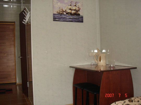 В номере есть необходимый набор посуды (тарелки, чашки, стопки, ложки, вилки, разделочная доска), электрический чайник, пепельница, солонка, поднос, открывалка для бутылок.