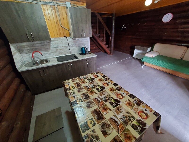 1 этаж: оборудованная кухня-гостиная с мебелью, с набором посуды, холодильником, эл. плитой, столом со стульями, телевизором, кондиционером, санузлом с душевой кабиной, водонагревателем, диван.