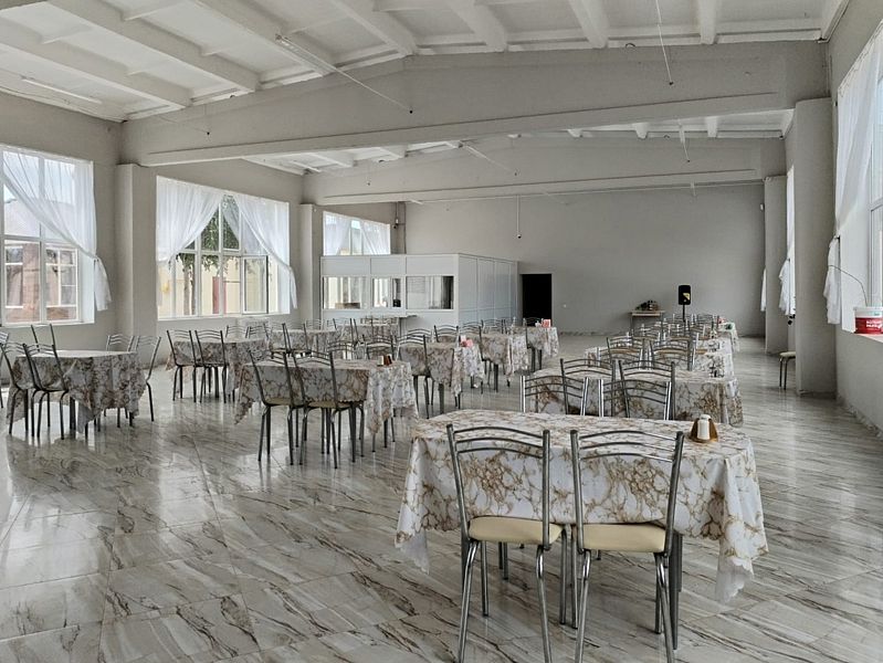 Большой банкетный зал. Предоставляются горячие блюда, закуски, салаты. Меню обговаривается.