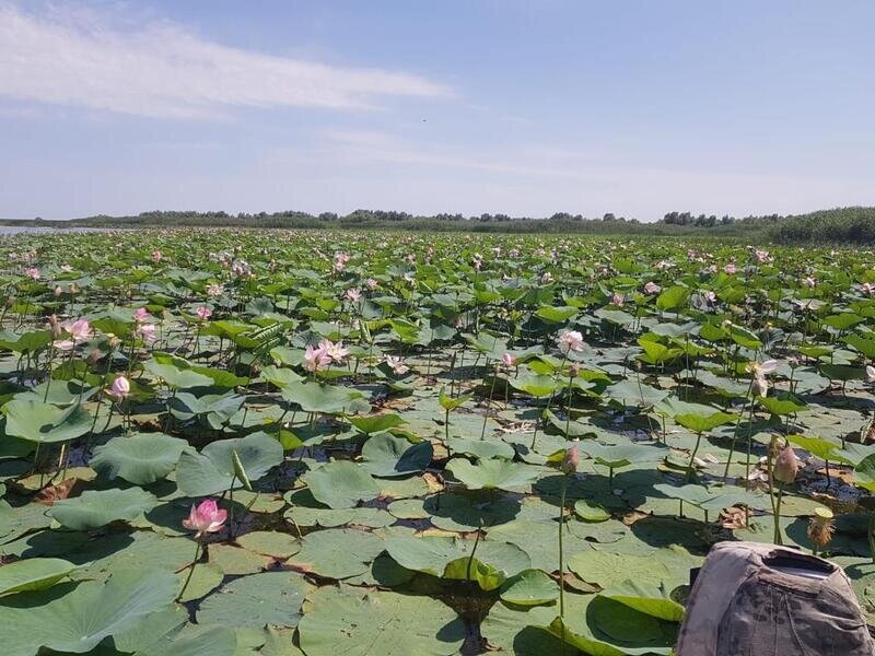 Прогулка на моторной лодке по реке ямное, на одну из проток В протоке поля лотосов и много рыбы .
