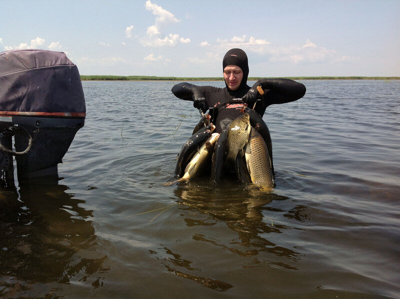 Одним из самых увлекательных видов активного отдыха на базе является подводная охота. Опытные егеря с удовольствием доставят Вас на так называемые «чёрные воды». Эти места в раскатной части Каспийского моря, с прозрачной водой, с глубинами от 1.5 до 5 метров, не оставят равнодушным даже самого бывалого охотника. Здесь сазан не то, что в чернях-бронзовые красавцы до 25 кг, а то и поболее.