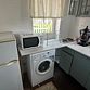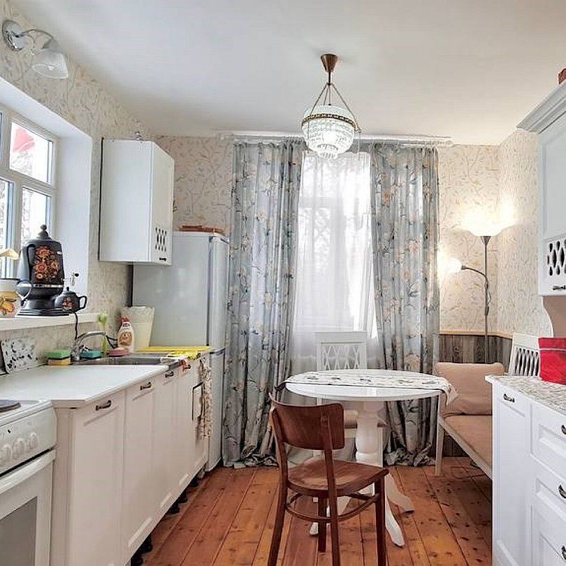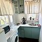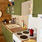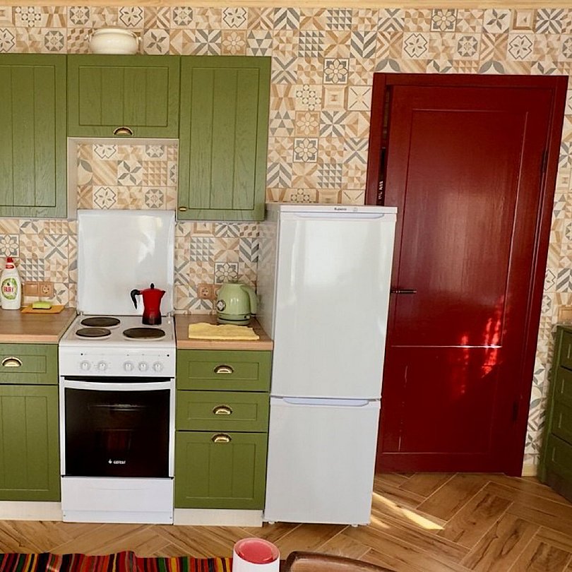 — Кухня с электрической плитой, холодильником, столом и стульями