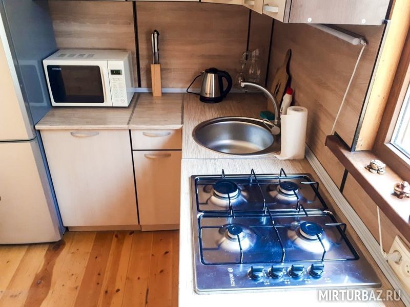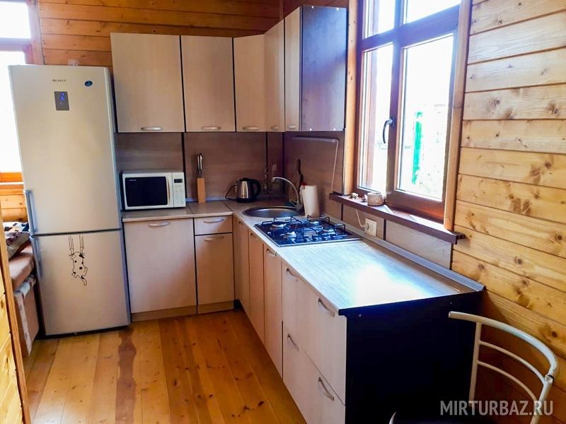 Кухня, просторный холл, спальня - 3 односпальные кровати + диван, душ, туалет, дом вмещает 3-4 чел.