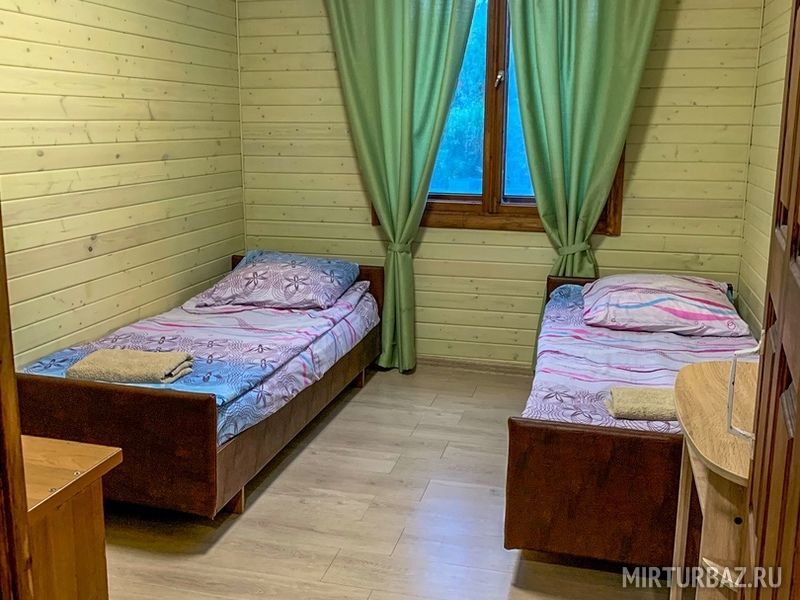 2 спальни - 2 двухспальные кровати и 4 односпальные, просторная кухня, душ, туалет, веранда, холл, дом вмещает до 6-8 чел.