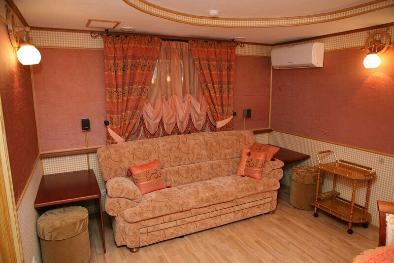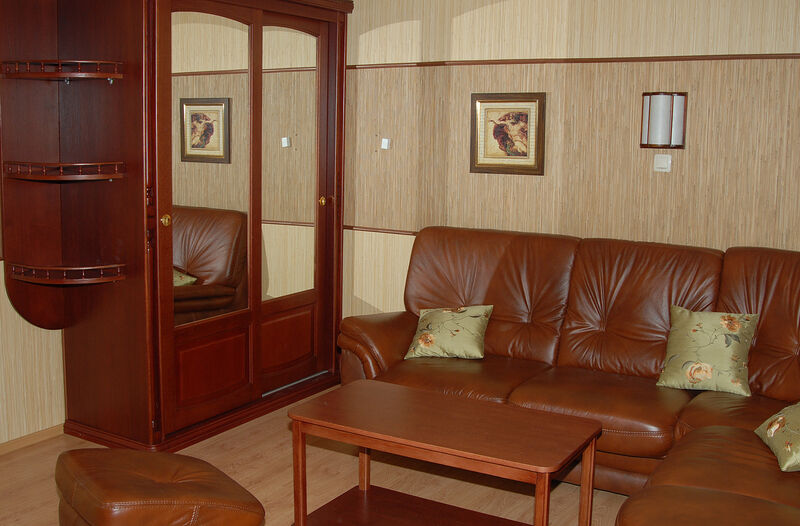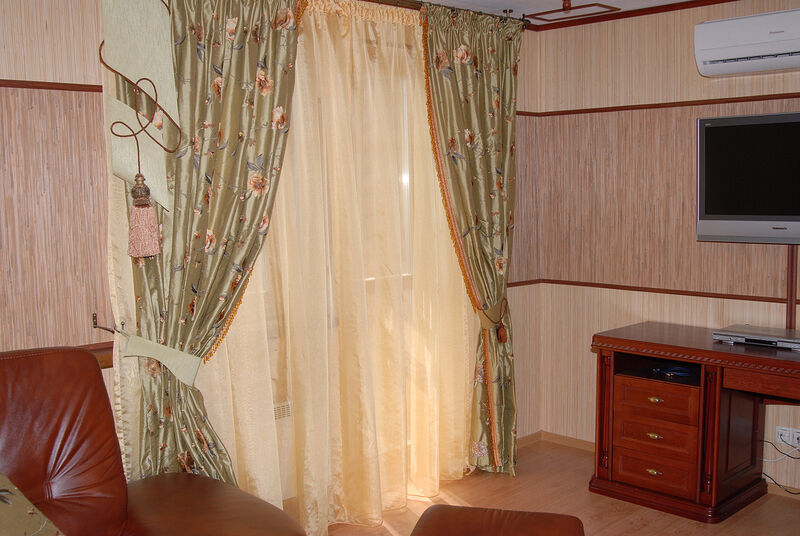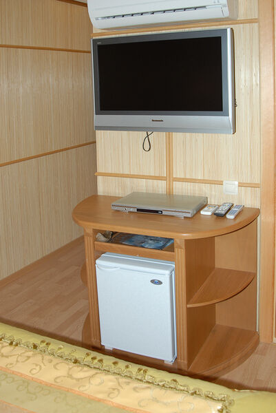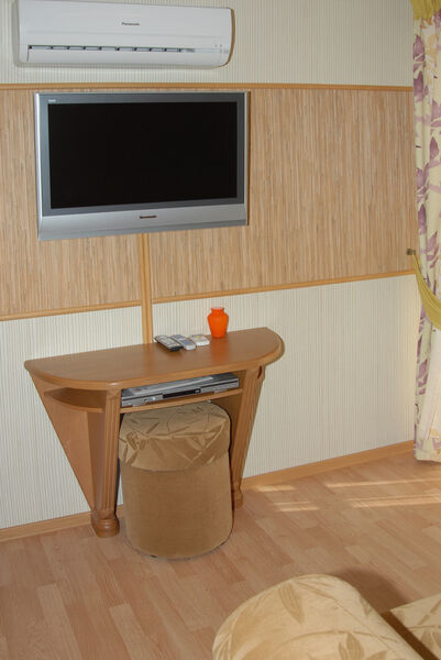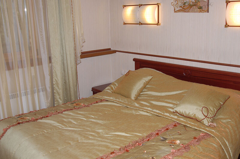 Номера люкс с двуспальной кроватью, двумя тумбочками, шкафом-купе, рабочим столом. Есть телефон, телевизор, DVD-проигрыватель, кондиционер и холодильник-бар.