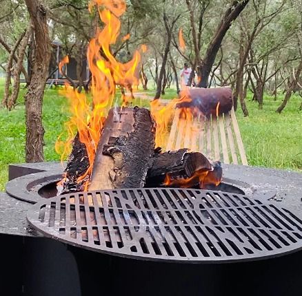Для вас большая освещенная беседка с мягкими подушками и костровая чаша для гриля или казана.