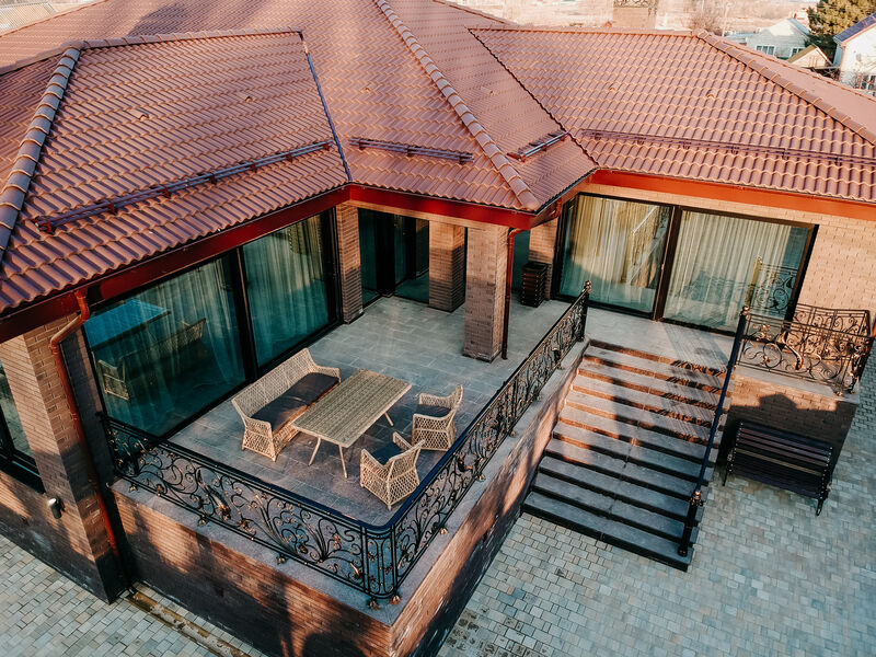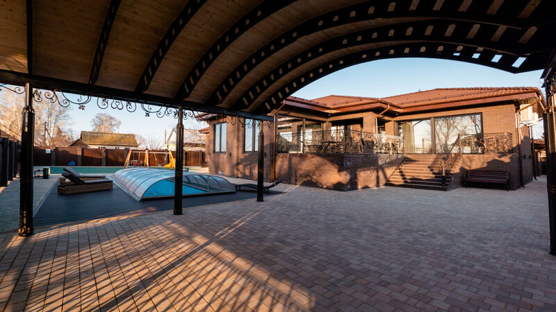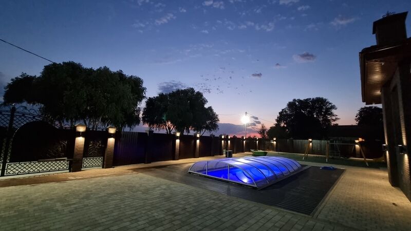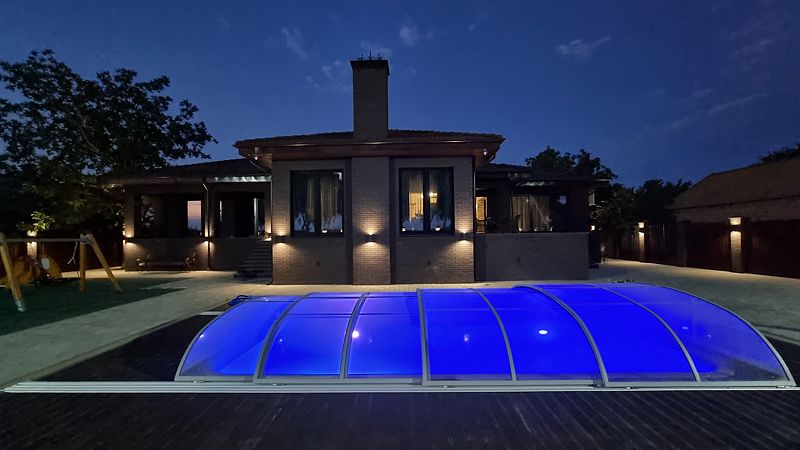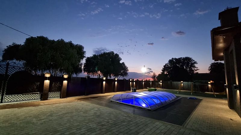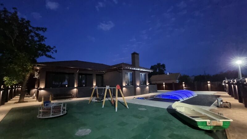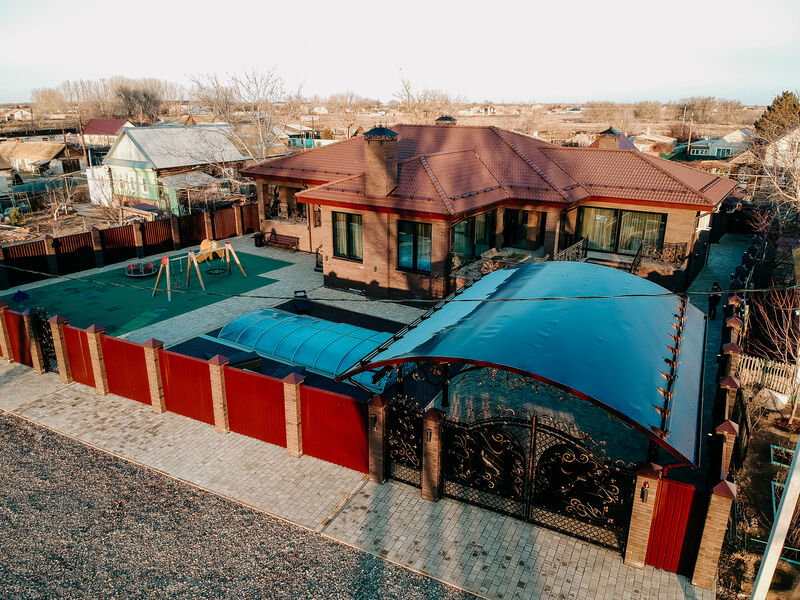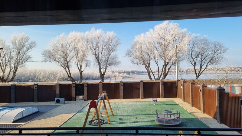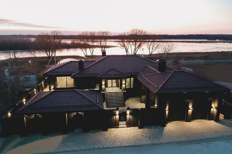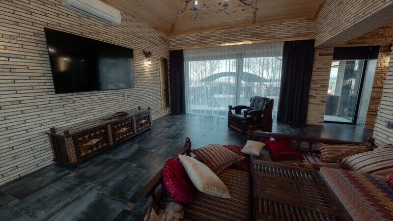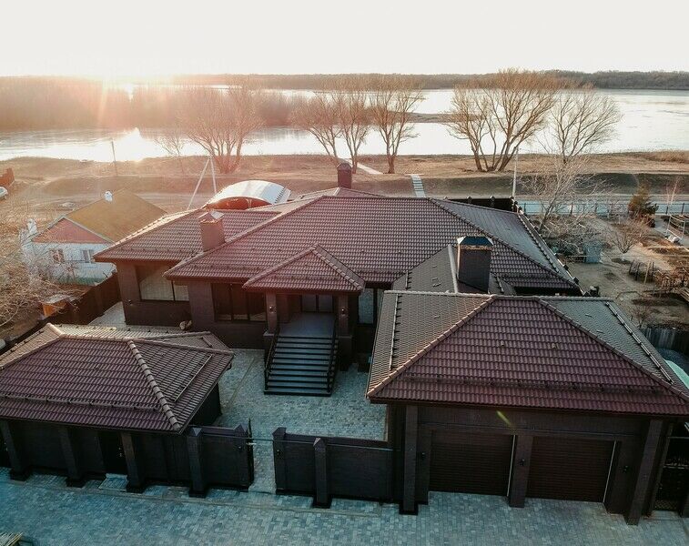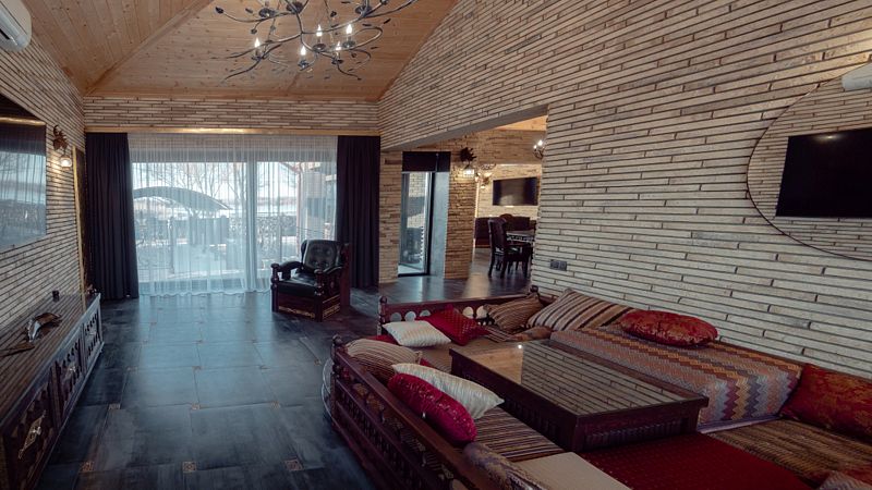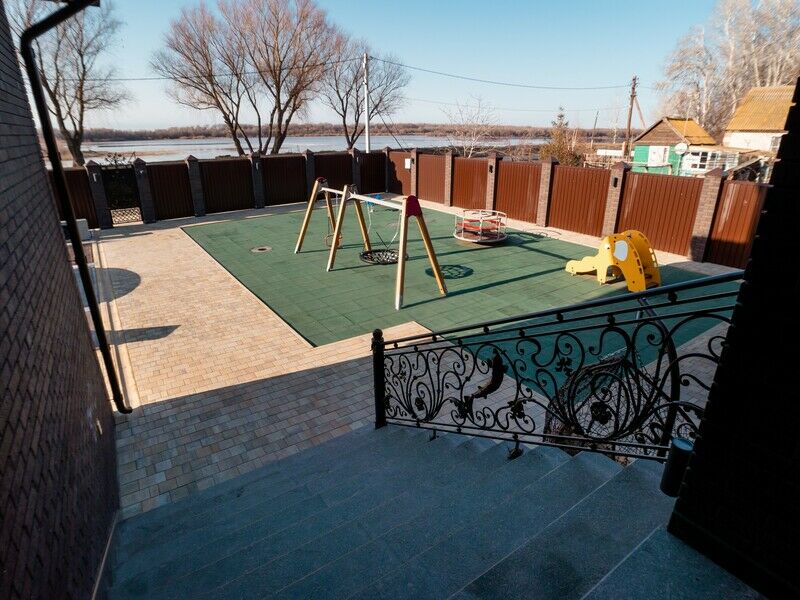 В гостевом доме 2 гостиные, 3 спальни с видом на реку имеют собственные выходы к бассейну, кухня с мангалом, столовая, прачечная комната, две стиральные машины, утюг, гладильная доска, два санузла, гараж на два автомобиля, тёплые полы, системы кондиционирования. Банный комплекс - хаммам. Бассейн с подогревом и противотоком, станцией водоподготовки. Детская площадка с аттракционами.