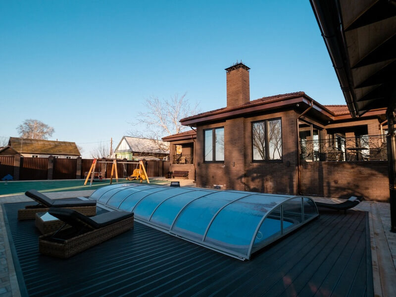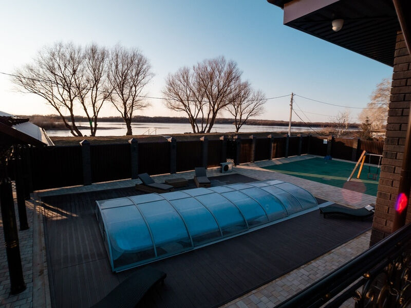 Гости могут насладиться плаванием в бассейне с противотоком и подогревом, расслабиться на массажных лежаках под роскошным навесом и насладиться живописным видом на реку с открытой веранды. А веранда под крышей обеспечивает комфортное пространство для отдыха даже в случае изменчивой погоды.
