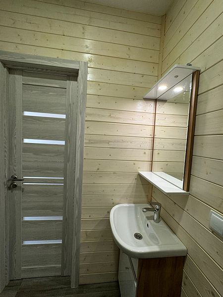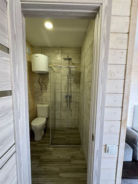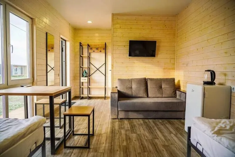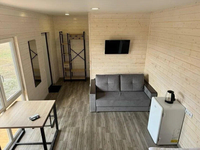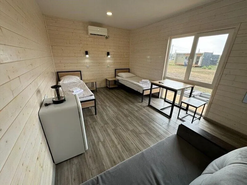 В номере: две раздельные кровати + раскладной диван для взрослого. Общая площадь 20 кв.м. Терраса 6 кв.м. Теплые полы, место для хранения вещей, ЖК телевизор, современная душевая кабина и туалет,