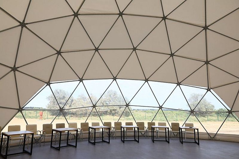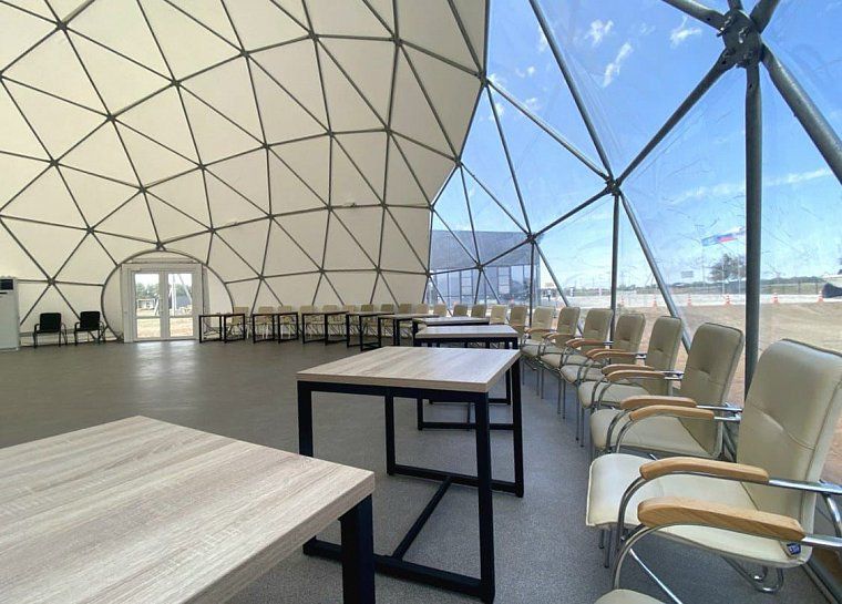 Конференц-зал организован в шатре — универсальное, функциональное и эффективное решение для проведения конференций, переговоров, совещаний, выездных мероприятий и торжественных событий крупного формата.