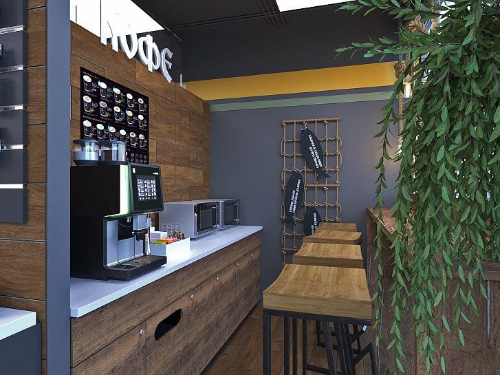 - Зона кофе-бара. Удобный формат перекуса, отдыха или ожидания, где расположена кофе-станция для приготовления горячих напитков и печь СВЧ для разогрева готовой еды.