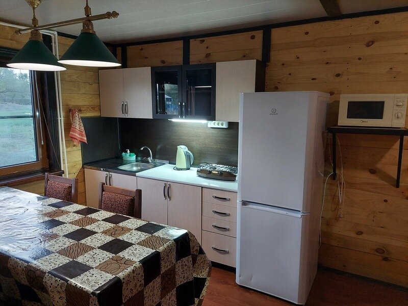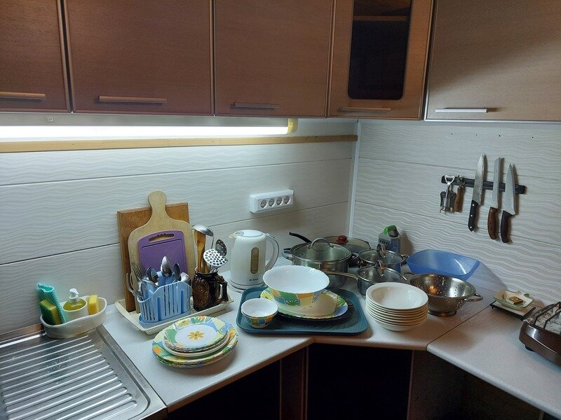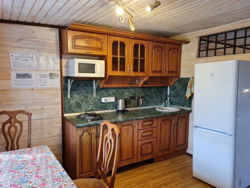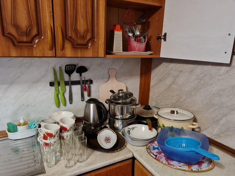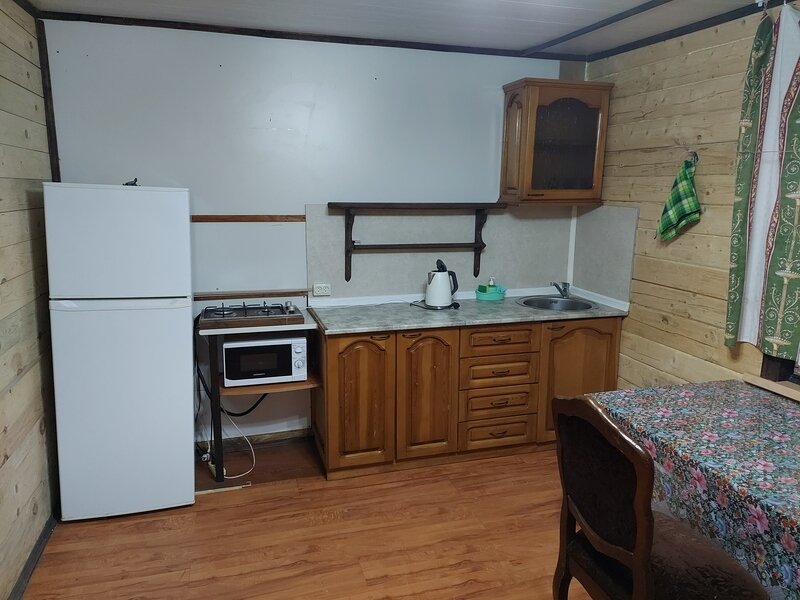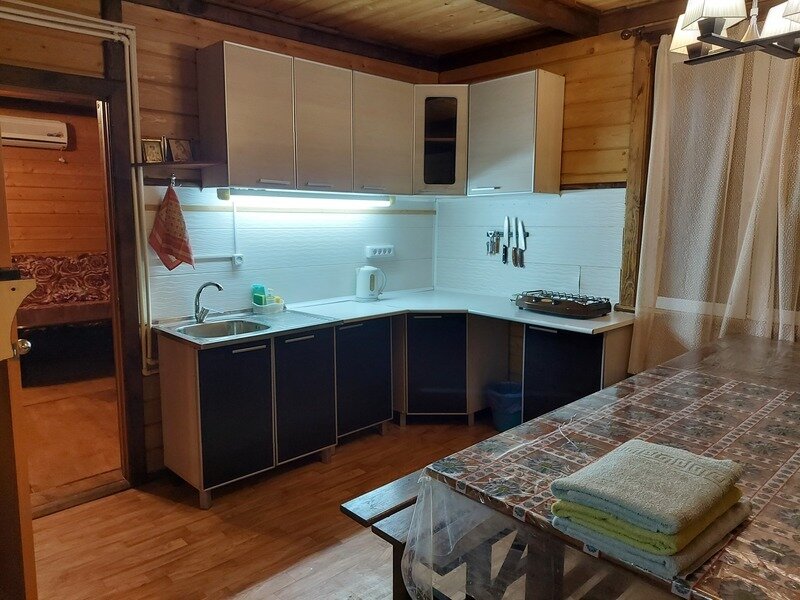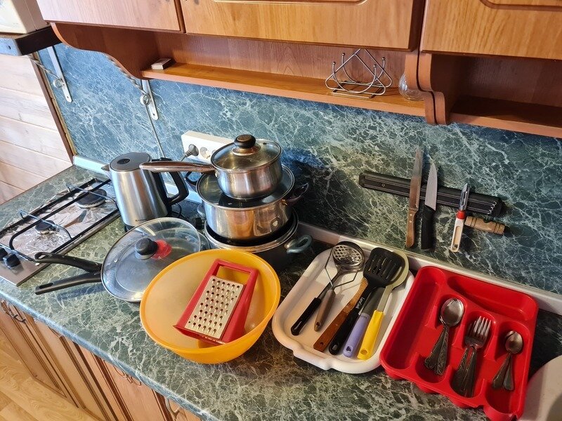 Оборудована кух. гарнитуром. Имеется посуда и необходимая утварь (тарелки, кружки, стаканы, стопки, кастрюли, сковородки, миски, столовые приборы, лопатки, доски для резки, терка и др.).
