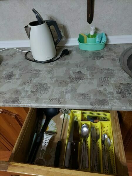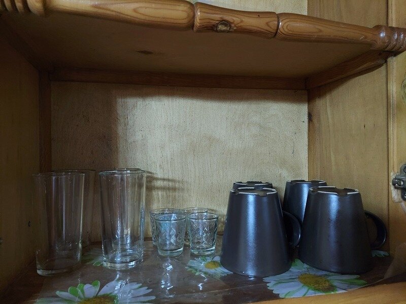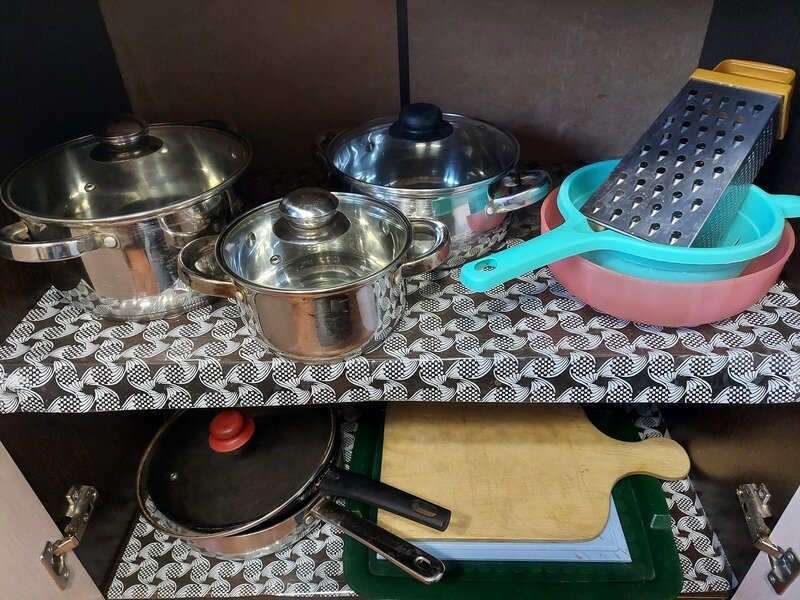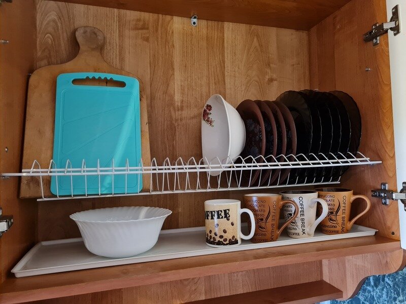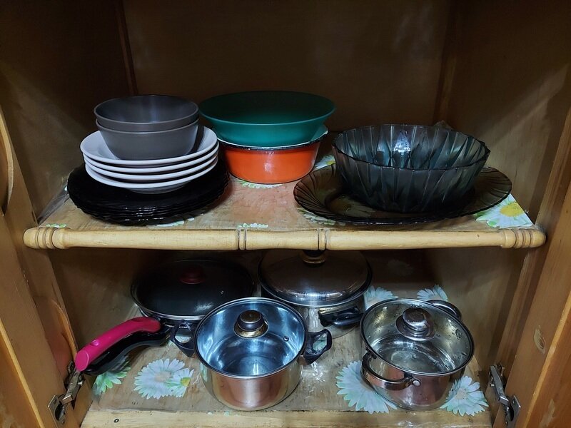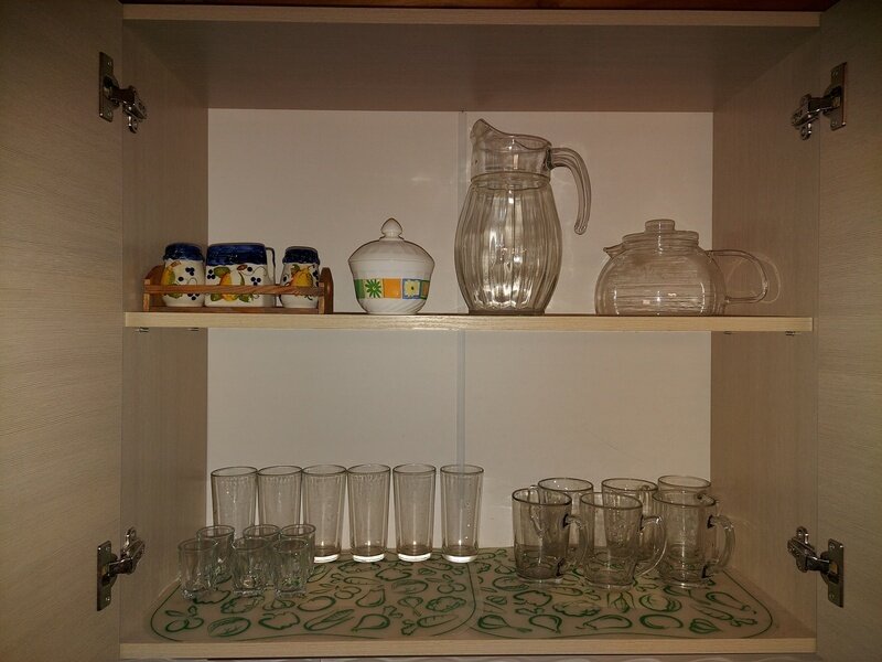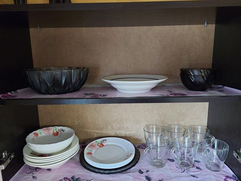 Оборудована кух. гарнитуром. Имеется посуда и необходимая утварь (тарелки, кружки, стаканы, стопки, кастрюли, сковородки, миски, столовые приборы, лопатки, доски для резки, терка и др.).