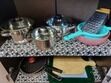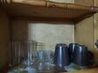 Оборудована кух. гарнитуром. Стоит раскладной диван. Имеется посуда и необходимая утварь (тарелки, кружки, стаканы, стопки, кастрюли, сковородки, миски, столовые приборы, лопатки, доски для резки, терка и др.).