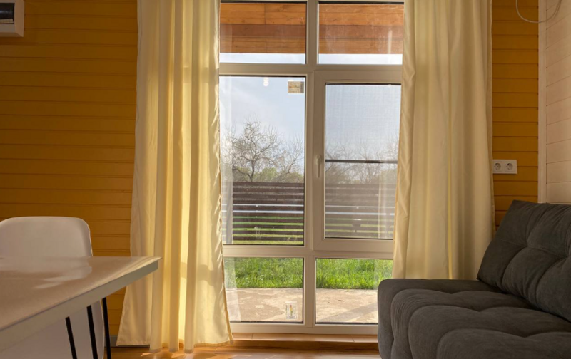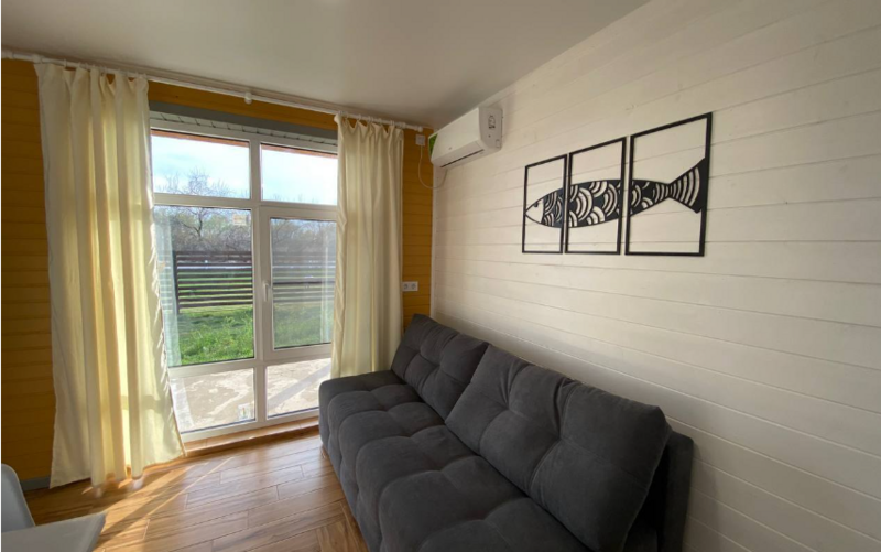 Каждый домик автономен: собственный огороженный дворик с отдельным заездом для автомобиля, своя веранда под навесом, отдельный морозильный ларь. Домики построены с любовью и вниманием к деталям; многое сделано собственными руками хозяев. Внутри вы найдёте удобные для готовки кухни-гостиные, технику, санузел с ванной и бойлером на 100 литром и спальни с удобными кроватями и специальными ортопедическими матрасами. Предоставляется новое хлопковое постельное бельё и подушки их натурального гусиного пуха, а также, по два полотенца на каждого отдыхающего. В кухне-гостиной дополнительно есть большой раскладной диван.
