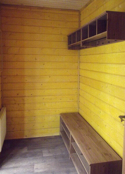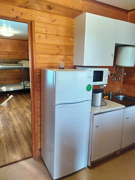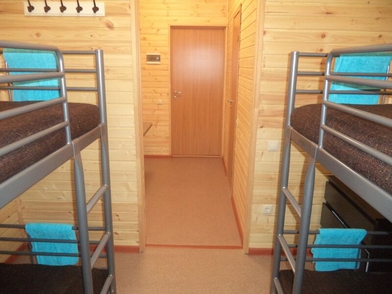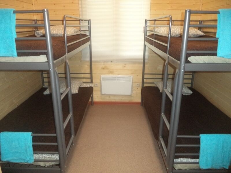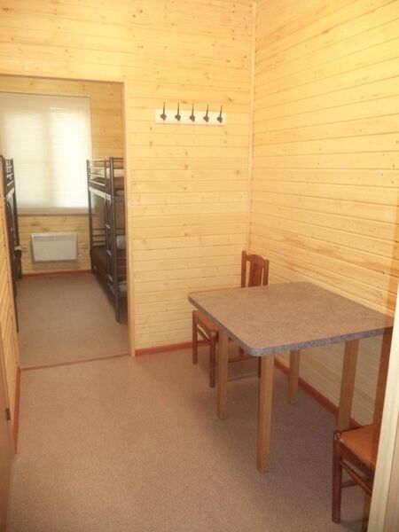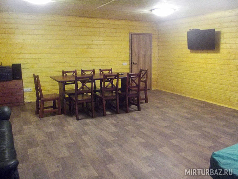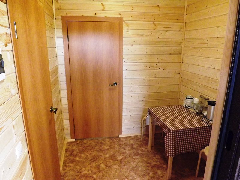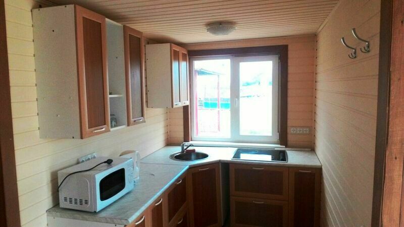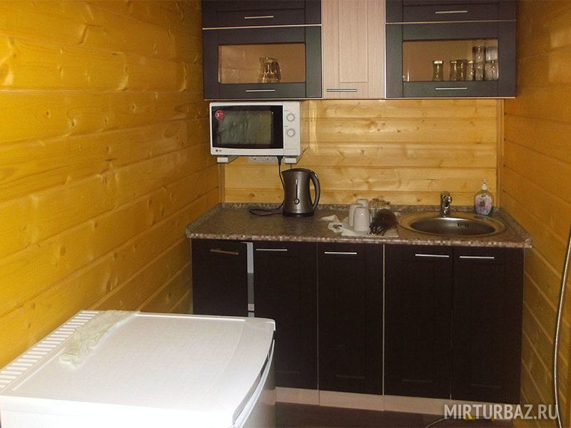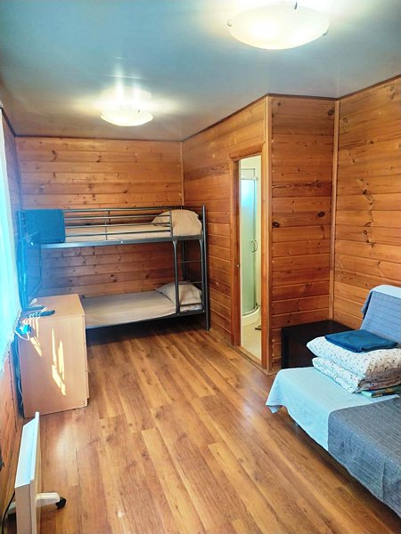 Комфортабельный дом со всеми удобствами — санузел с душем и туалетом, мини-кухня, СВЧ-печь, холодильник, электрический чайник, телевизор, спутниковое ТВ. В доме одна двухъярусная кровать, одна двуспальная кровать и раскладной диван. Рядом со всеми кроватями имеются тумбочки.
