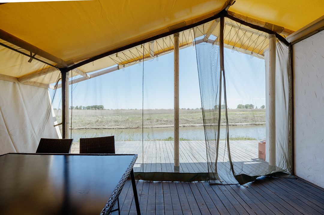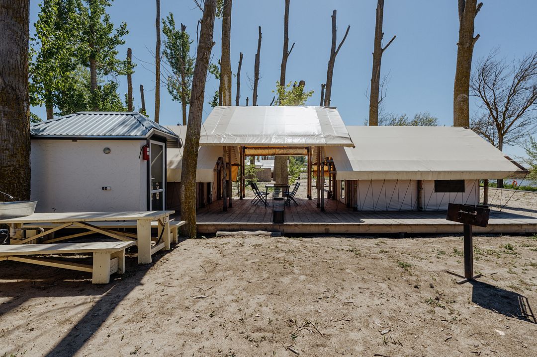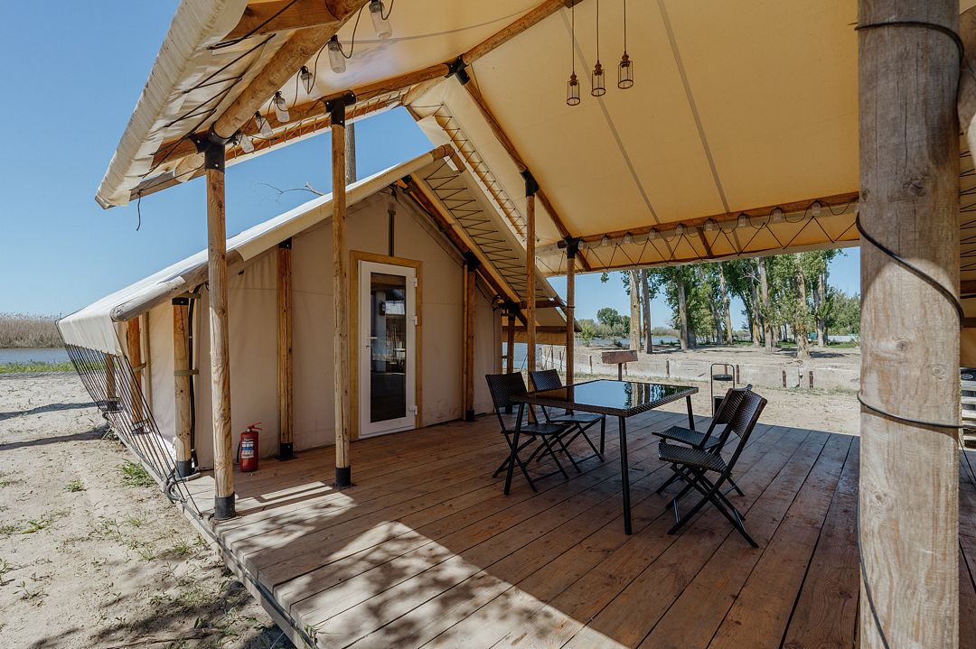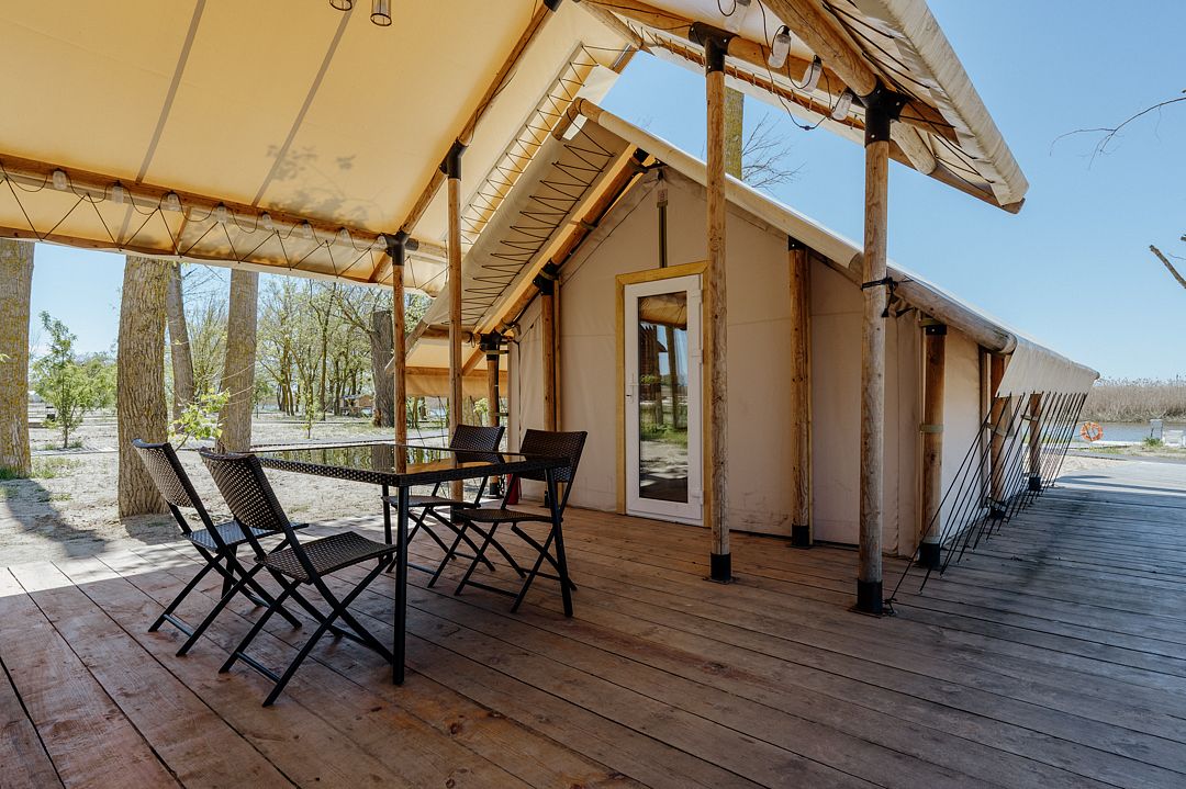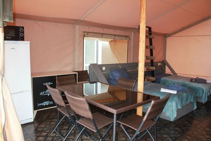 Сафари-Тент, 36 м², 2 комнаты. Вместимость до 4 мест. Один ребёнок до 12 лет — может разместиться без отдельного спального места. Имеется собственный санузел, зона барбекю и индивидуальный выход к пирсу для рыбалки.