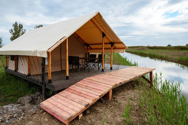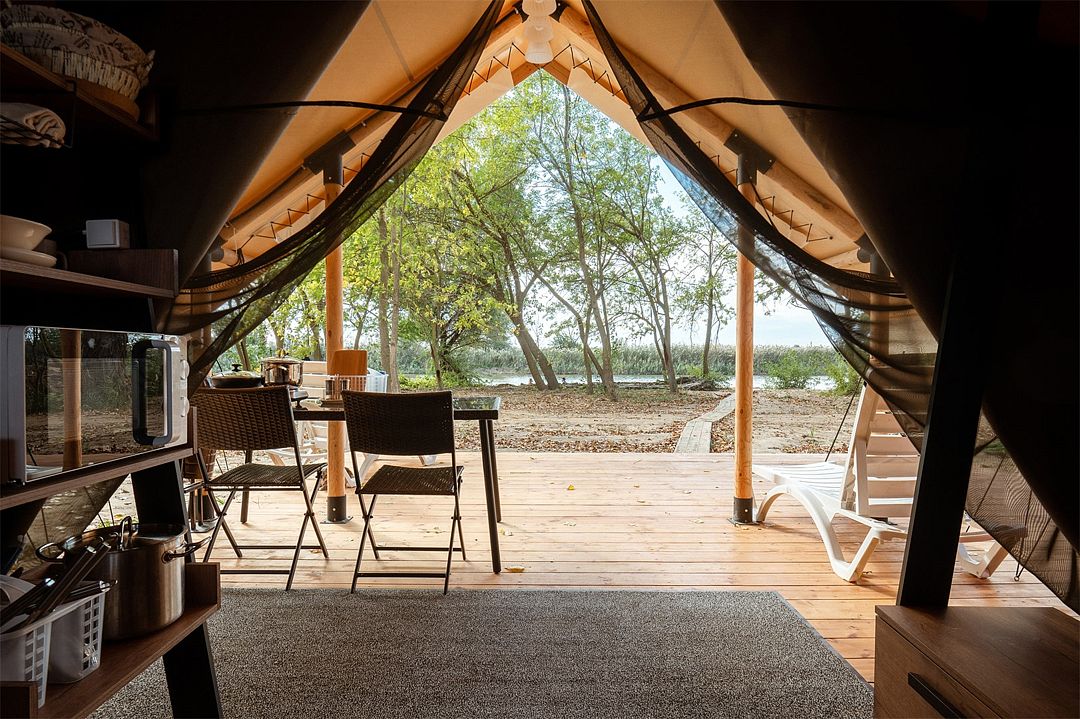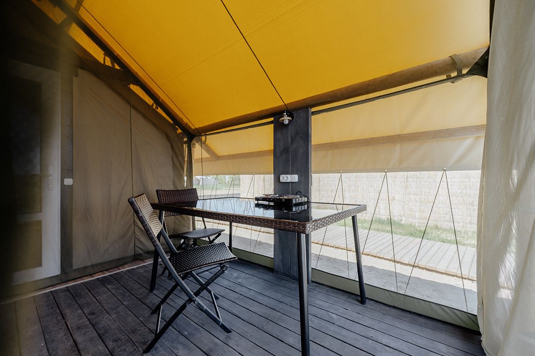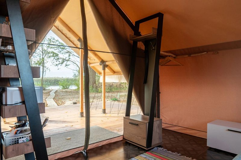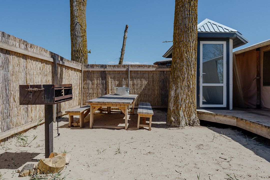 Сафари-Тент, 36 м², 2 комнаты. Вместимость до 4 мест. Один ребёнок до 12 лет — может разместиться без отдельного спального места. Имеется собственный санузел, зона барбекю и индивидуальный выход к пирсу для рыбалки.