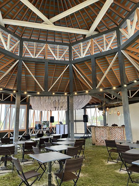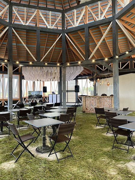 Зона отдыха представлена шатрами, каркасным бассейном, большими пуфами, гамаками.