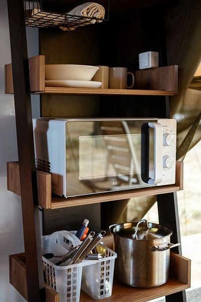 В распоряжении гостей мангальная зона, в номере — холодильник, микроволновая печь, чайник, электрическая плита, посуда и кухонные принадлежности.