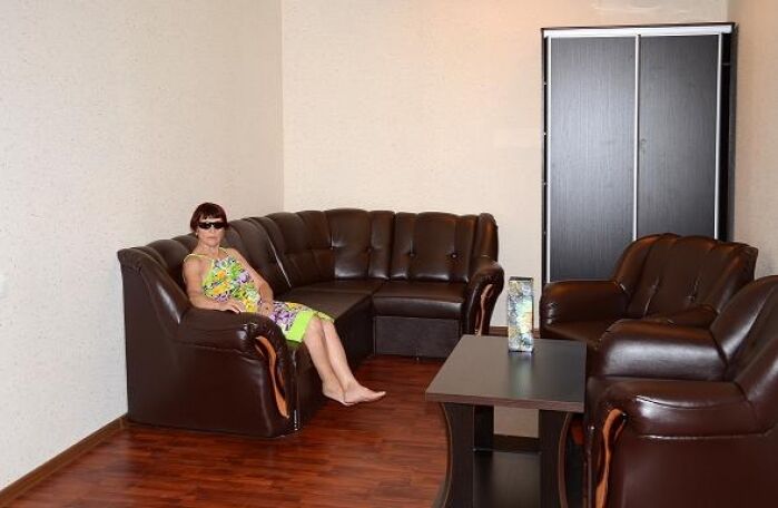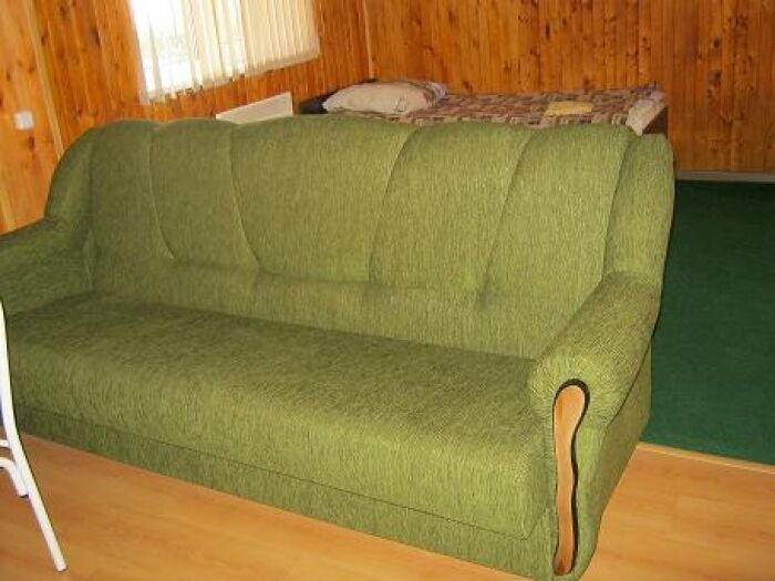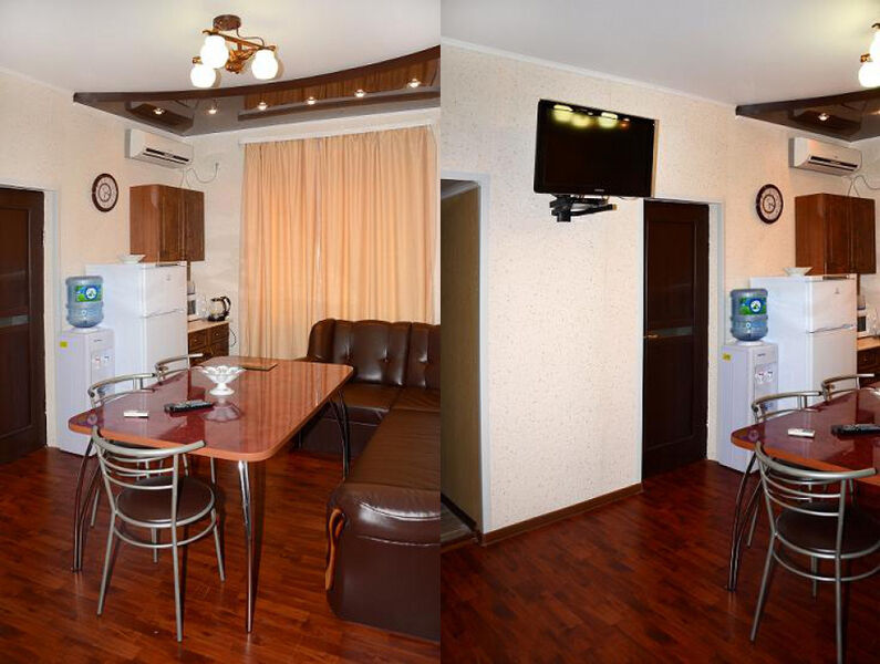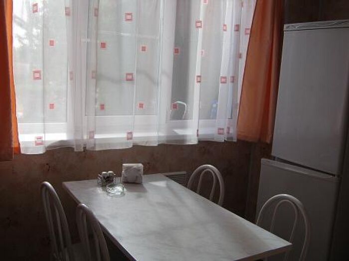 Одна большая комната (2 кровати и двуспальный диван), столовая комната, санузел.