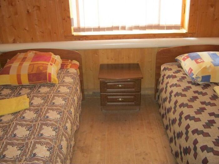 Три спальни по две кровати, гостиная (два двухспальных дивана + 2 кресла), санузел, сауна (2-3 человека).