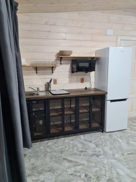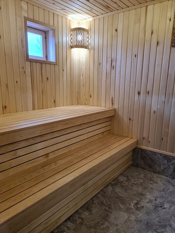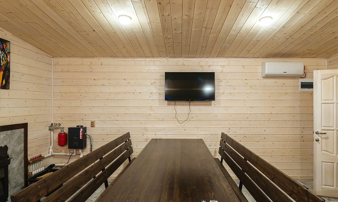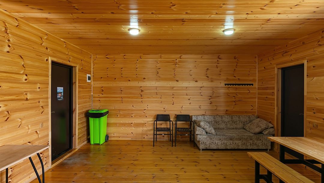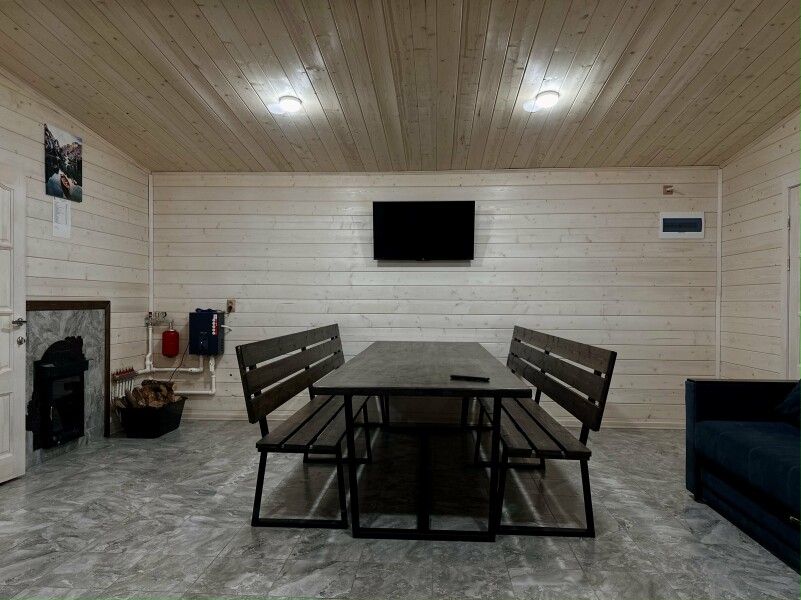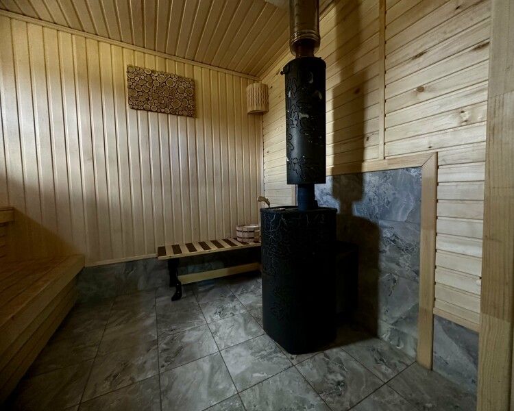Инфраструктура: зона отдыхаБаня на дровах с уютной террасой, идеально подходящая для расслабляющего отдыха. Внутри расположена просторная парная с печью, зона отдыха, оборудованная сплит-системой для комфортного микроклимата, а также холодильник, посуда и доступ к цифровому телевидению и бесплатному Wi-Fi.