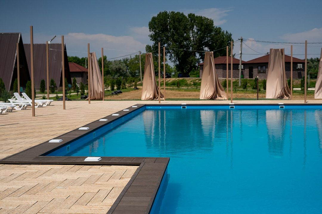 На территории базы отдыха «Лазурная» расположен открытый бассейн, где кристально чистая вода поддерживается благодаря двум мощным фильтрам и автоматической системе дозирования. Каждый фильтр, наполненный почти двумя тоннами фильтрующего материала, неустанно очищает воду, сохраняя ее безупречное качество.