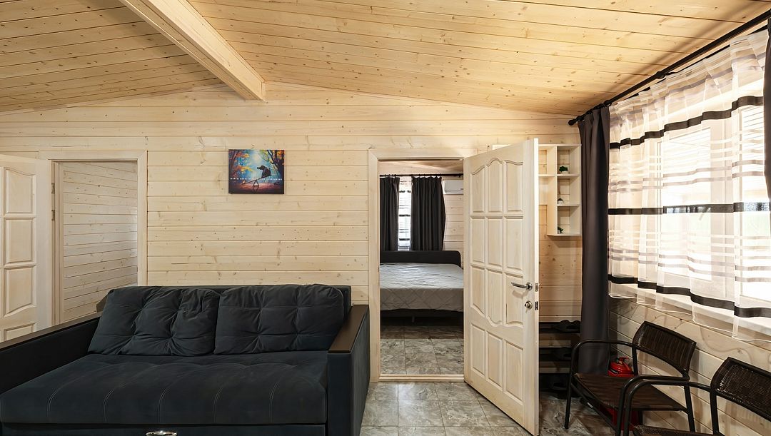 Двухэтажный фрейм-дом на четыре спальных места и позволяет комфортно разместить до шести человек. Также по желанию к Вам могут приехать гости до шести человек.