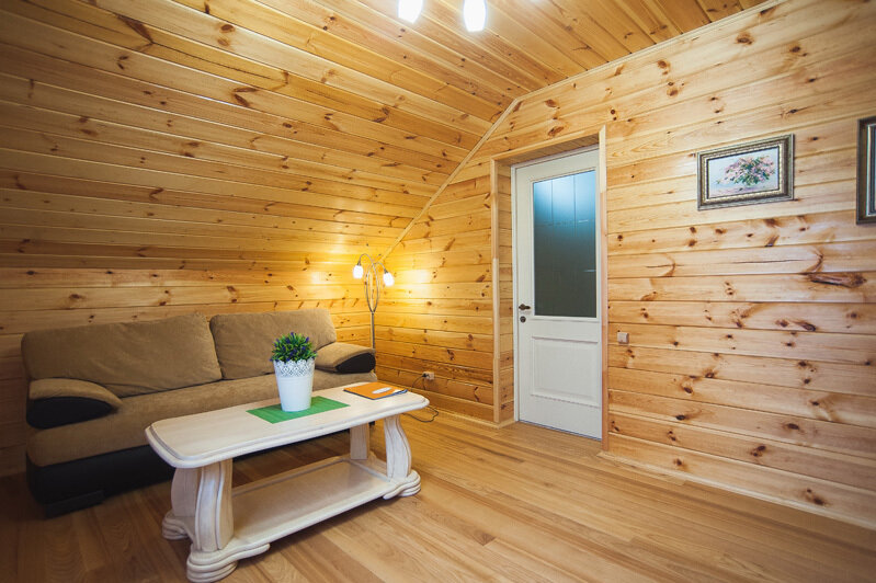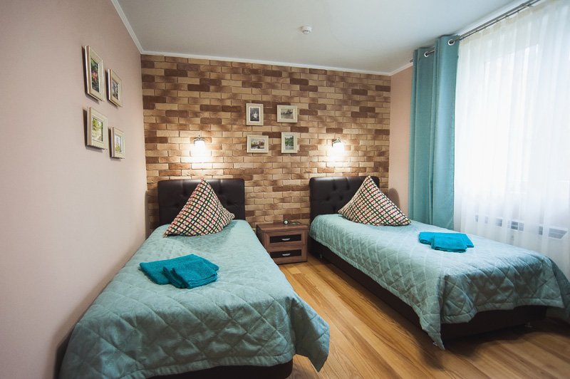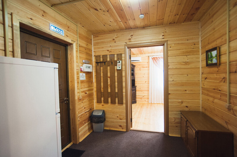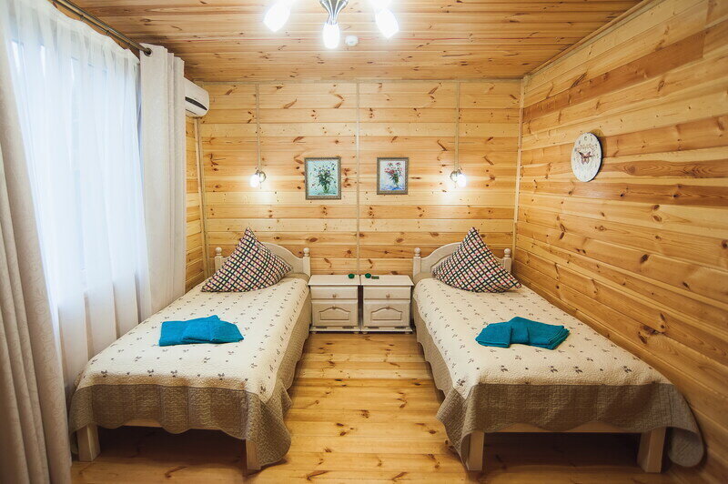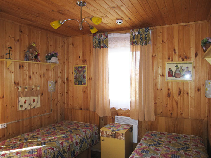 Трехэтажный коттедж. 1 этаж : столовая, бильярд, сауна, душевая, санузел и технические помещения. Проживание на 3 этаже - один 2х-комнатный номер (2 одинаковые комнаты), общая гостиная с ТВ и чайным столом, 1 санузел, маленький холодильник в каждом номере.