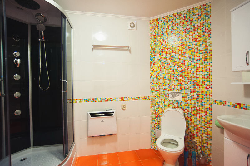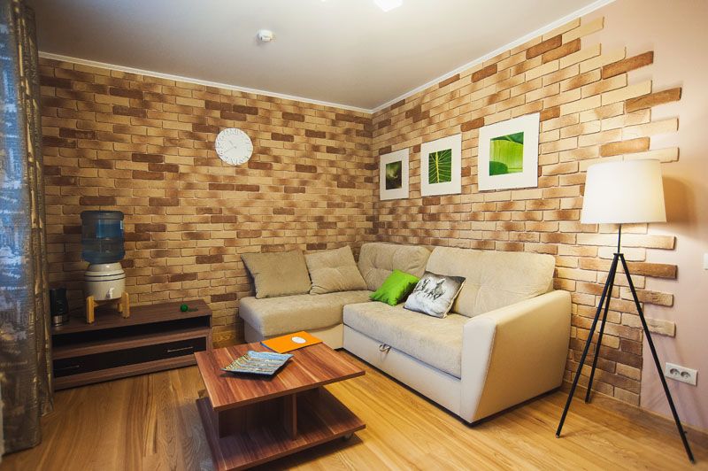 Общая гостиная с ТВ и чайным столом, 2 санузла, маленький холодильник в каждом номере.